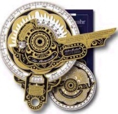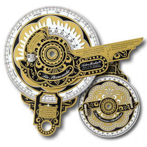 Wir haben zwei Versionen anzubieten: - ein prachtvolles Kartonreplikat einer Sternenuhr nach Originalen aus dem 17. Jahrhundert: Es zeigt die Zeit mit Hilfe von Polarstern und Großem Wagen an, man kann sie im Dunkeln sogar mit den Fingerspitzen ertasten. Auf der Rückseite befindet sich ein Seemanns-Astrolabium, mit dem sich bei Tag die Höhen von Sonne, Landmarken oder Gebäuden bestimmen lassen. (Gestanzter, massiver A3 Karton, mit edlem Golddruck.)