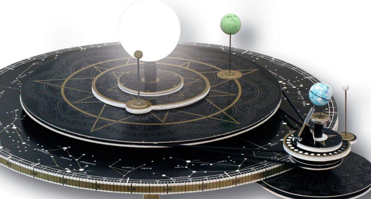 Mit dem Kopernikus-Planetarium bietet AstroMedia* erstmals ein mechanisches Planetenmodell an, das die Bewegungen der inneren Planeten Merkur und Venus sowie des Mondes und der Erde zeigt, wobei diese sich um ihre schräg stehende und immer gleich ausgerichtete Achse drehen.