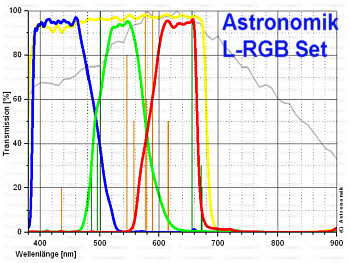 LRGB TYP 2c Filterset: Die Transmissionseigenschaften der L-RGB TYP 2c Filter sind für die CCD-Astrofotografie optimiert: Mit diesem Filtersatz gibt es nun endlich Filter, mit denen WIRKLICH eine farbechte Aufnahme aller Objekte möglich ist. Sowohl Kontinuumstrahler als auch Objekte, die nur in einzelnen Linien strahlen, werden in ihren wahren Farben wiedergegeben. Man gewinnt CCD-Aufnahmen, die das Objekt farblich optimal zeigen, genau wie es mit dem bloßen (aber viel Lichtempfindlicheren) Auge gesehen würde. Damit setzt sich diese Filterreihe als weltweit einzige von allen anderen Herstellern ab.