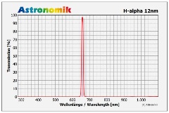 Der H-alpha Filter erhöht den Kontrast zwischen Wasserstoffnebeln und dem Himmelshintergrund. Durch die schmale Halbwertsbreite bei gleichzeitig hoher Transmission von nahezu 100% im Bereich der H-alpha Linie erreicht der Filter eine wesentlich größere Kontraststeigerung als breitbandigere Filter. Die Halbwertsbreite von 12nm ist optimal auf die Verwendung von typischen CCD und CMOS Sensoren abgestimmt.