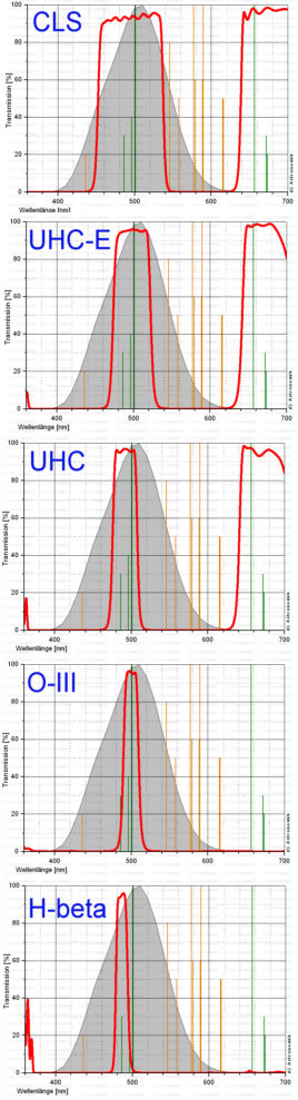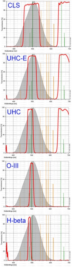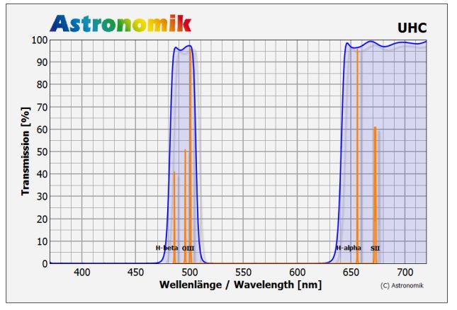 Für Teleskope kleinerer Öffnung als 5" (127mm) ist auch der UHC-E Filter mit seiner größeren Halbwertsbreite geeignet. Ab 10" (250mm) Öffnung kann auch ein OIII Filter zum Einsatz kommen, der durch seine Schmalbandigkeit nochmals den Kontrast bei bestimmten Objekten merklich erhöht.