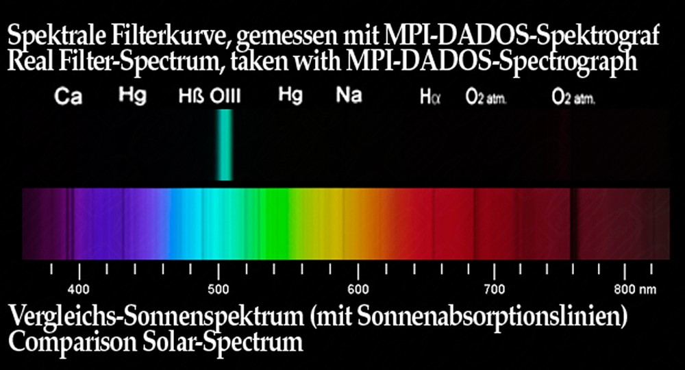 Planoptisch poliert für höchste Abbildungsgüte. Nur 10nm Halbwertsbreite mit Transmission von 93 Prozent. Für Beobachtungen Planetarischer Nebel bei höchstem Bildkontrast.