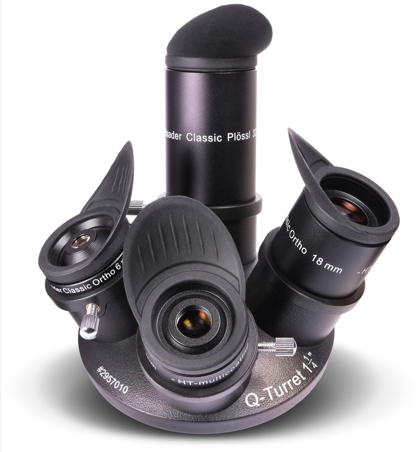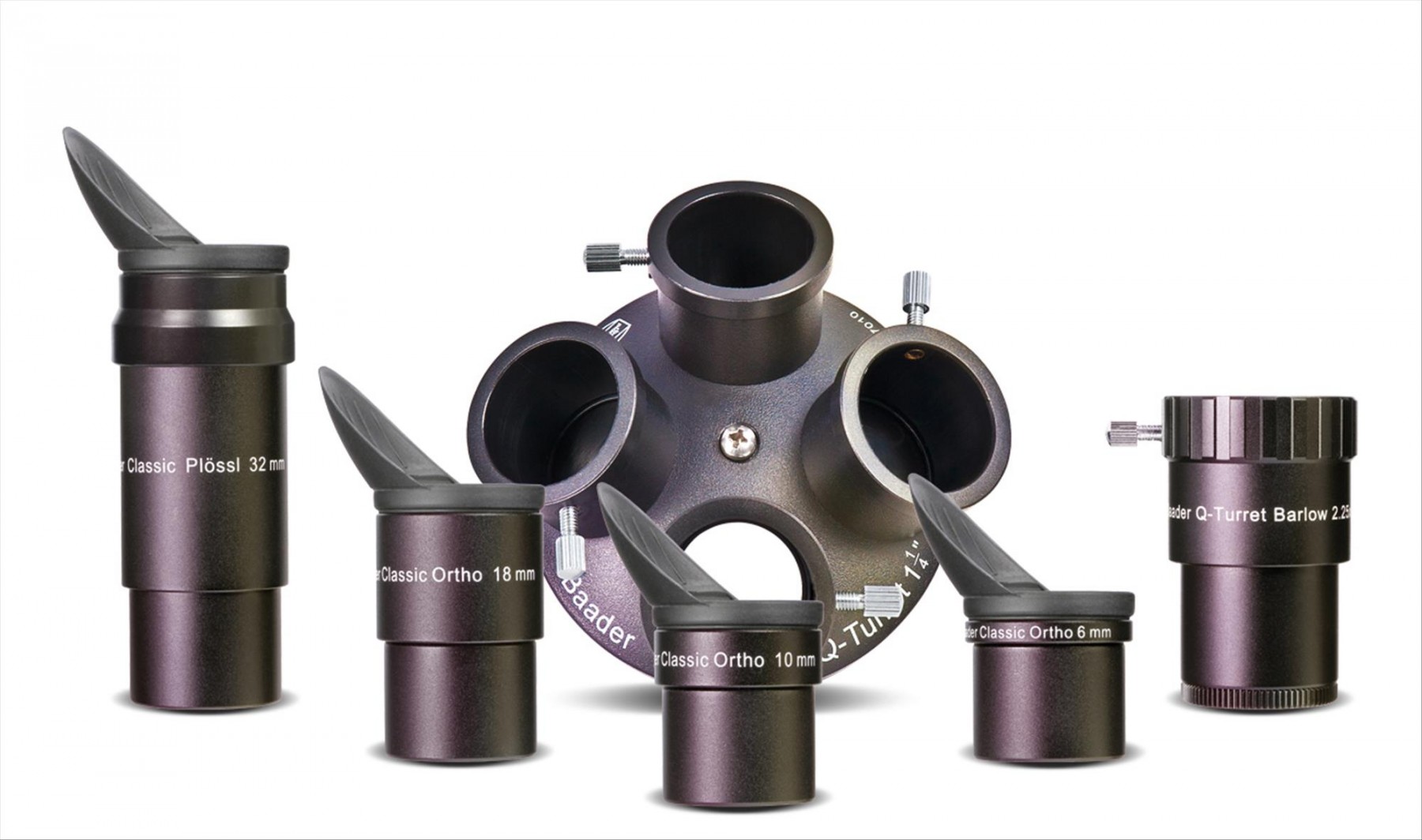 Die vier Okulare sind so abgestuft, dass sie an den meisten Teleskopen sinnvolle Vergrößerungen ergeben; die dazu gehörende Barlow füllt die Lücken aus, ohne doppelte Vergrößerungen zu liefern. Das 32mm-Plössl-Okular zeigt das größtmögliche Gesichtsfeld, das mit 1,25"-Okularen erzielt werden kann, und die drei Orthoskopischen Okulare liefern kontrastreiche Bilder auch bei hohen Vergrößerungen.