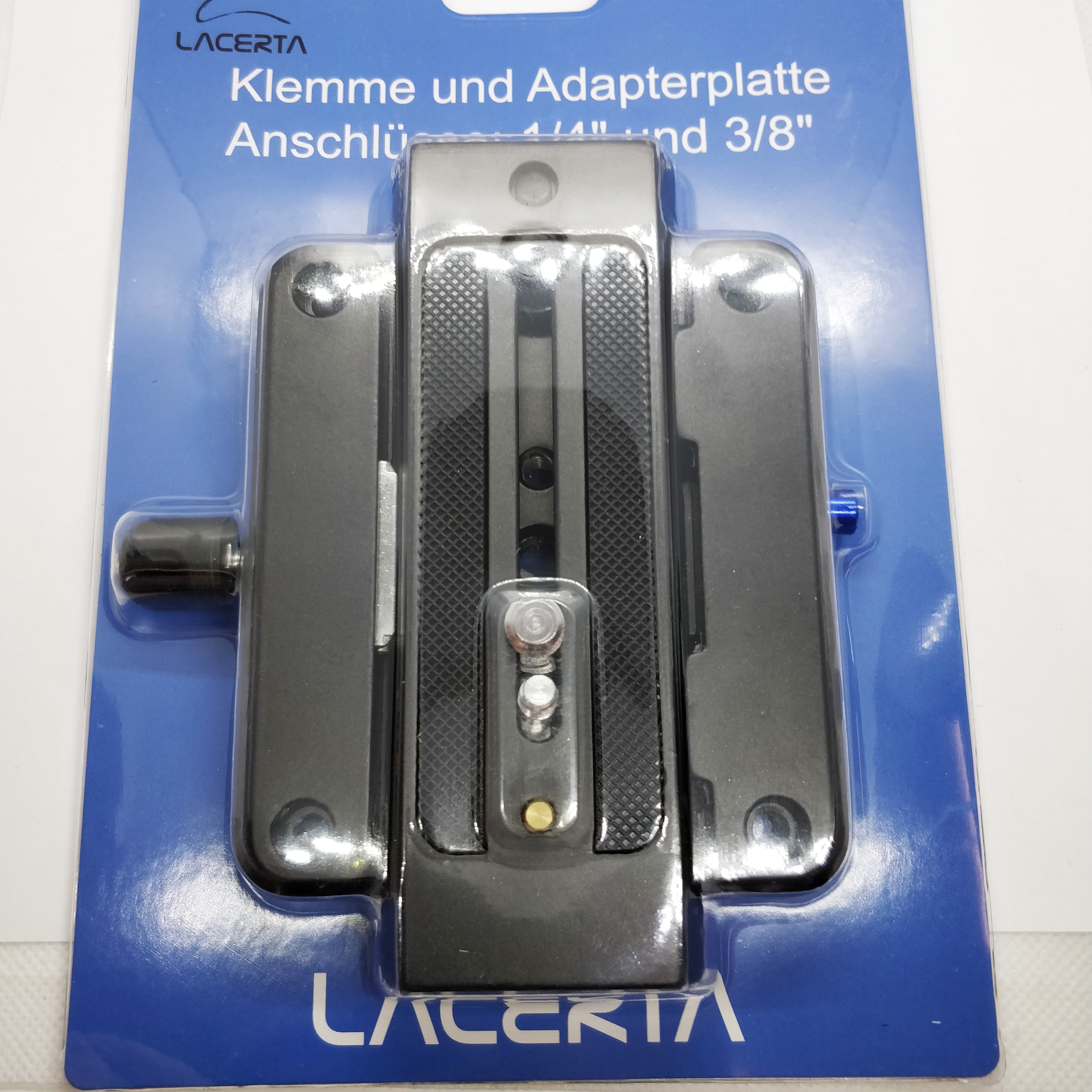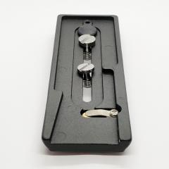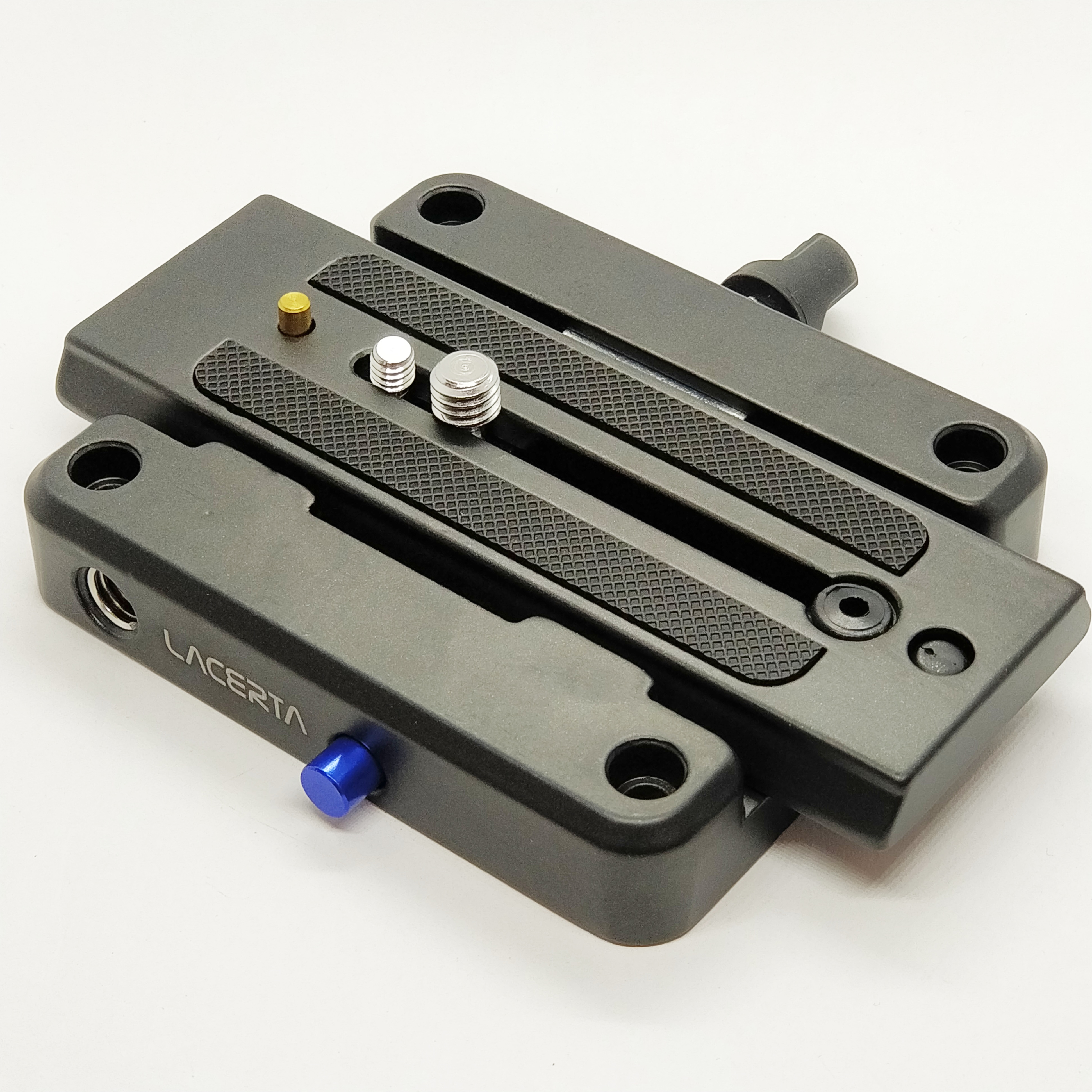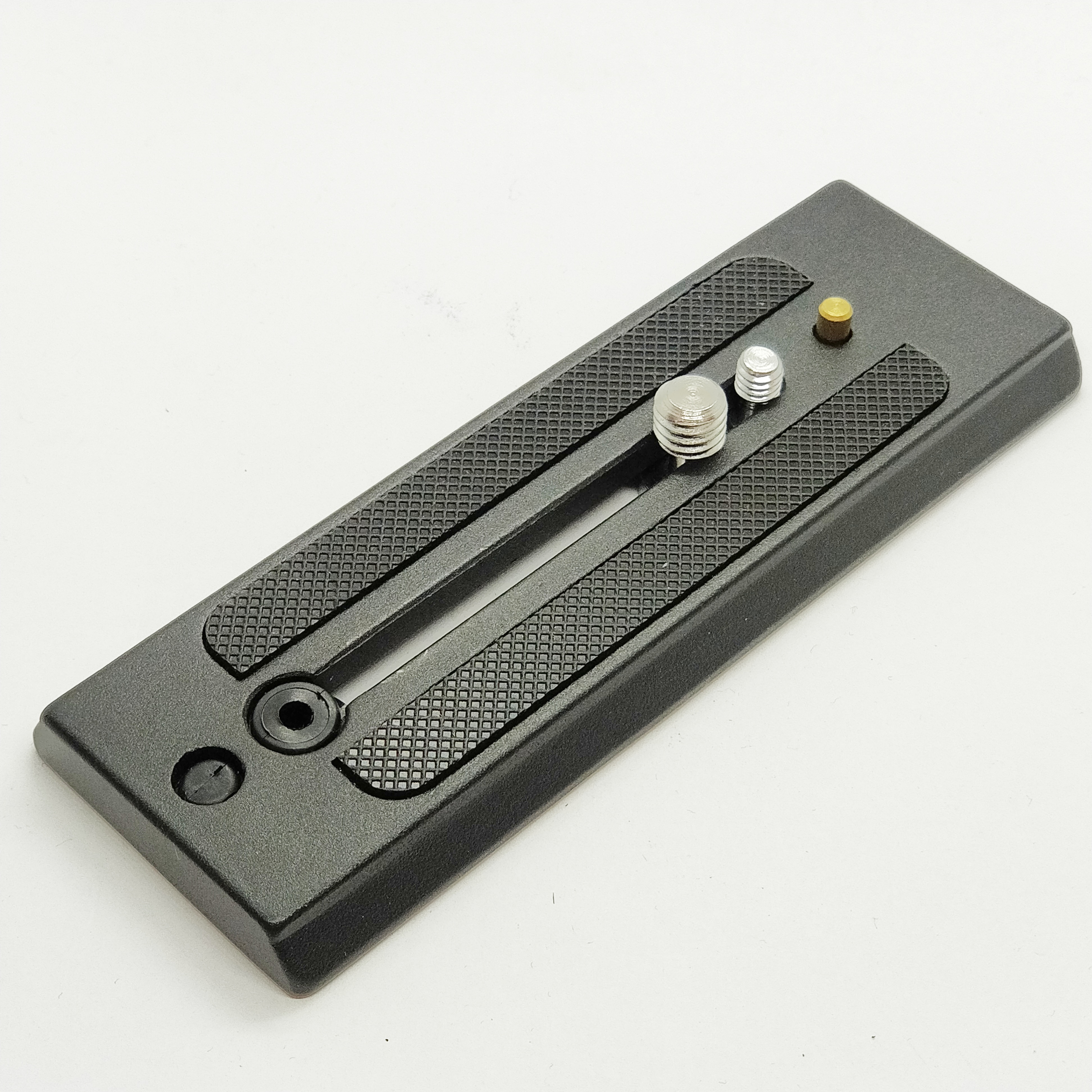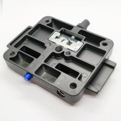 Die Basis ist 110mm lang und 95mm breit, inklusive einem Schnellwechsel-Platte für Fotoequipment. Sowohl 3/8 Zoll als auch 1/4 Zoll Zubehör kann an der Platte befestigt werden. Die trapezförmige Platte ist gummiert, unten 50mm, oben 42mm breit und 140mm lang.