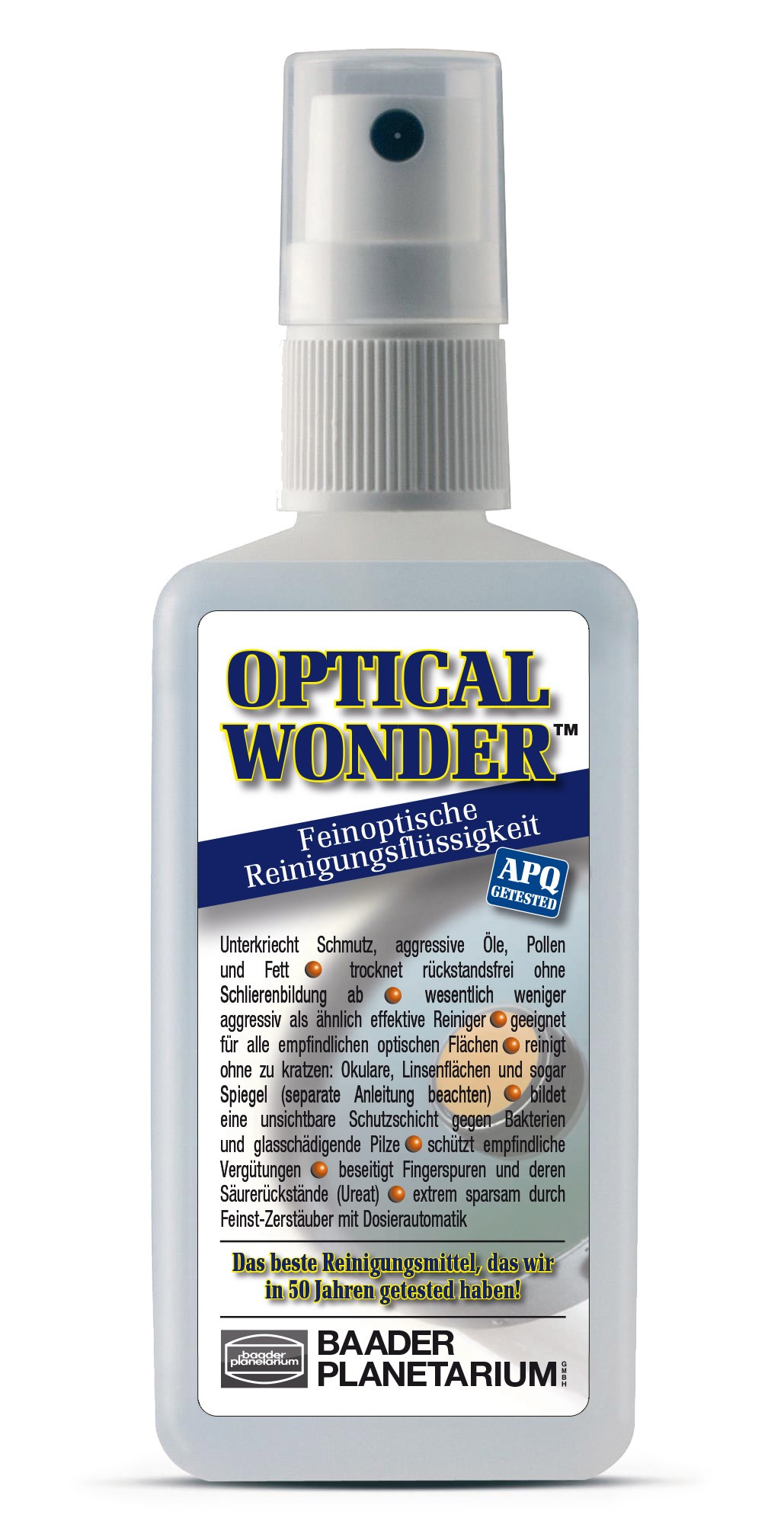 Die Baader Optical Wonder Reinigungsflüssigkeit ist zur Reinigung von Objektiven, Okularen, etc. gedacht und reiningt rückstandslos, ohne die Vergütung anzugreifen.
