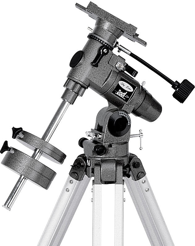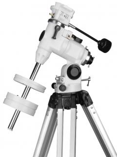 Die EQ-3 ist eine ordentliche, kleine parallaktische Montierung mit guter Ausstattung. Die Polhöhe kann feinfühlig eingestellt werden und wird beidseitig gekontert. Da verstellt sich nichts mehr! Optional kann ein Polsucherfernrohr und Motorantriebe nachgerüstet werden. Es gibt einen Motor nur für RA-Nachführung, aber auch einen Dualantrieb, der die Motorisierung beider Achsen erlaubt. Sie haben damit dann schon eine gute Ausrüstung für den Einstieg in die Astrofotografie. Ebenfalls gehört ein solides Alustativ mit 65 mm breiten Beinen zum Lieferumfang.