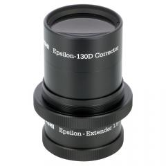 Takahashi ist es gelungen, für den Epsilon-130D einen Extender zu entwickeln, der die ausgezeichnete Sternabbildung auf der Achse wie im Feld beibehält. Die Brennweite wird um den Faktor 1.5x auf 650mm verlängert (f/5), daher ist der Epsilon auch für die Fotografie kleinerer Objekte geeignet, was das Einsatzspektrum deutlich erweitert. Es ist optisch ein hoher Bauaufwand erforderlich, der Extender ist mit 7 Linsen in 5 Gruppen aufgebaut. Er korrigiert mindestens so gut wie der originale 2-linsige Korrektor und erreicht Spot-Größen von nur 2 Mikrometer auf der Achse und maximal 8 Mikrometer in den Ecken vom Vollformat. Auch die Ausleuchtung ist mit 60% bei Vollformat erfreulich gut. Die Montage am Tubus ist denkbar einfach, der originale Korrektor wird einfach durch den Extender ersetzt. Mit diesem Extender ist der Epsilon auch besser für die Beobachtung einzusetzen, es wird daraus ein entspannter 1:5 Newton, was wesentlich weniger Anforderungen an die Okulare stellt.