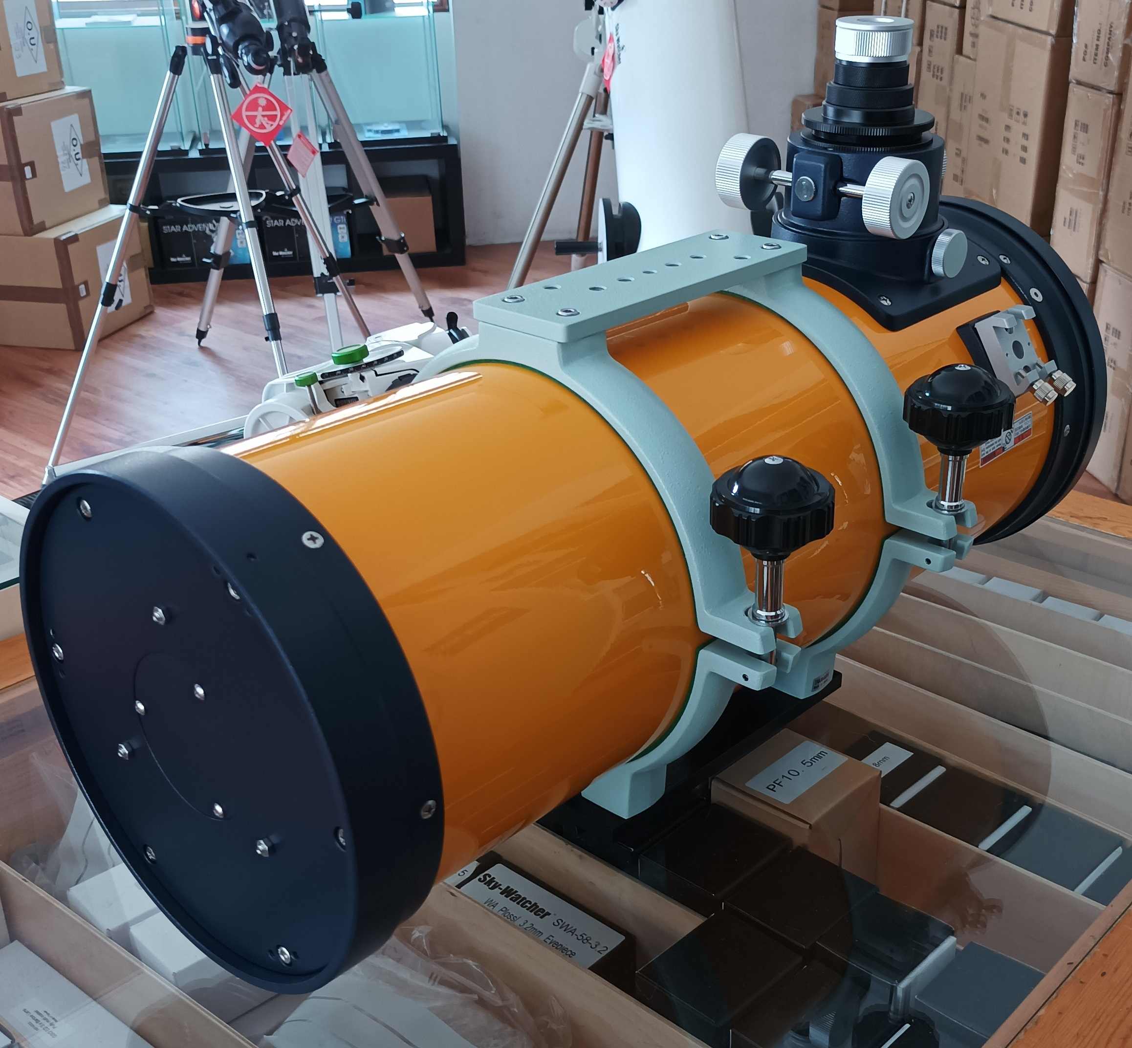 Der Okularauszug entspricht der Bauform am Epsilon-130ED, es ist ein stabiler Zahn-/Trieb-Auszug, der an der Basis voll rotierbar ist und mit dem Mikrofokus MEF-3 nachgerüstet werden kann. Wir bieten auch einen passenden Adapter für unseren Lacerta MFOC-Motorfokus an. Der zweilinsige Korrektor ist im Okularauszug verschraubt, Adapter auf 1,25“ gehören zum Lieferumfang. Hinten bei der Hauptspiegelzelle kann die zentrale Platte zur schnelleren Auskühlung des Spiegels entfernt werden, die Schrauben hinten sind alle versenkt, der Tubus kann daher auch aufrecht abgestellt werden. Am Tubus ist eine Aufnahme für Sucherteleskope vorhanden, hier können die Takahashi 6x30 und 7x50 Sucher befestigt werden, mit der FindFFTKup Klemme können auch andere Sucher oder Guidescopes montiert werden. Okularauszug, Hauptspiegelzelle, Sucher-Basis, sowie der vordere Ring sind in der neuen Farbe Schwarzblau lackiert!