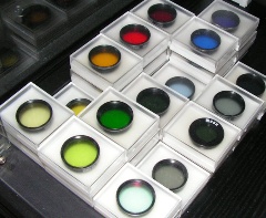 Farbfilter erhöhen den Kontrast bei Planeten und Mondbeobachtung. Es scheint zwar paradox zu sein, aber allgemein gilt, dass ein Filter seine eigene Farbe dämpft und seine Komplementärfarbe hervorhebt. So wird z.B. der berühmte Grosse Rote Fleck auf dem Jupiter nicht mit einem rotem, sondern mit einem grünen oder blauen Filter besser sichtbar, da der Fleck dann dunkler als seine Umgebung erscheint. Für die blaugraufarbigen Marsgebirge empfehlen wir eben deshalb einen orangen Filter, u.s.w. Ein schwacher Gelbfilter kann auch den Farbfehler von Achromaten verbessern und so ein schärferes Bild liefern. Die Filterfassungen sind aus Metall und hochwertig verarbeitet, die Fassung hat selbst wieder ein Innengewinde, somit ist es auch möglich, mehrere Filter zu kombinieren. Die Filteroberflächen sind entspiegelt, das Filterglas ist planparallel.