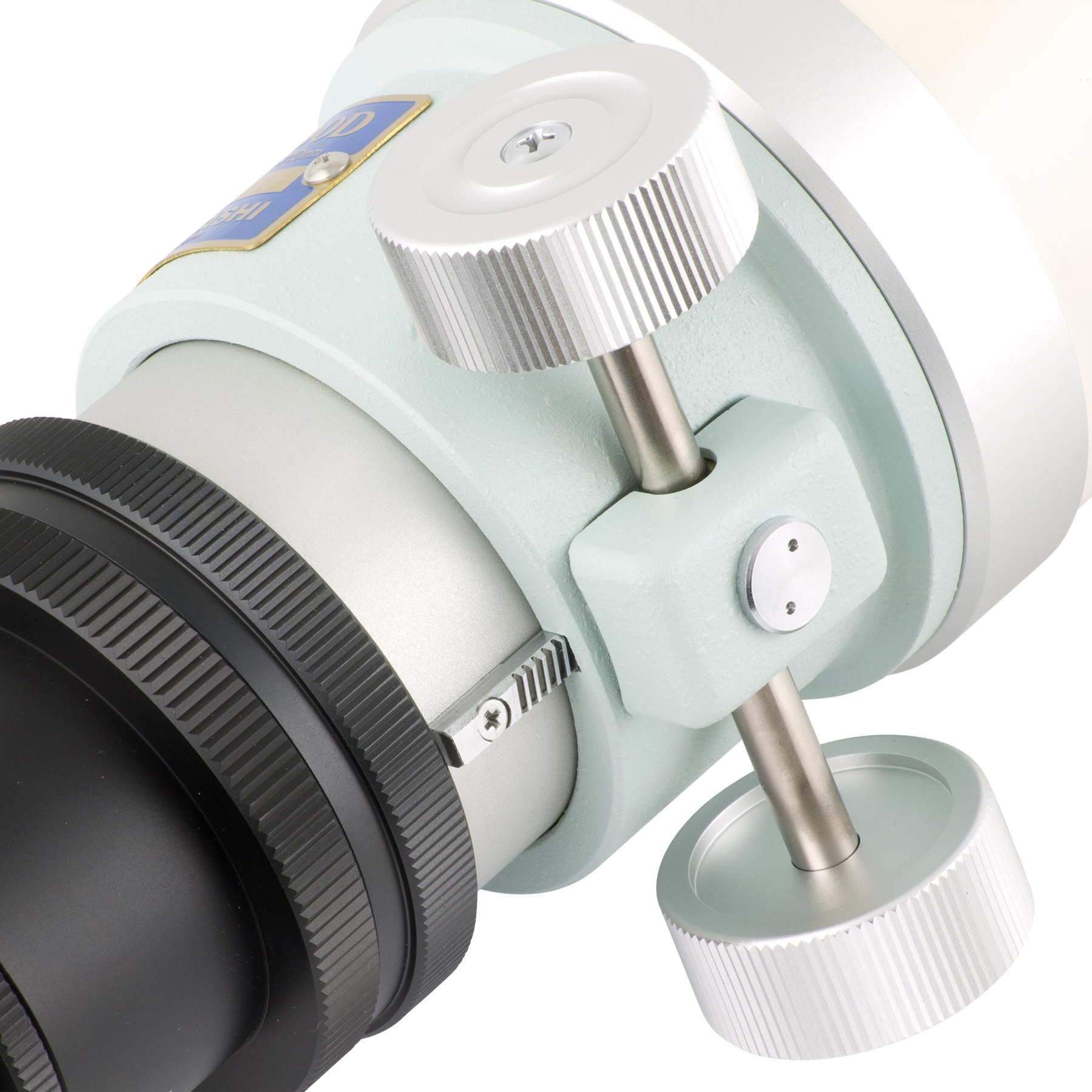 Der Tubus hat einen schlanken Durchmesser von nur 95mm, für einen 100mm Apo ist er wirklich sehr kompakt gebaut und in etwa so groß wie der alte FS-78. Um den Preis so günstig wie möglich zu halten, wurde auf eine einschiebbare Taukappe verzichtet. Der Okularauszug mit 70mm Rohrdurchmesser ist deutlich belastbarer als der kleine des DC-Modells und kann daher schwerere Kameras tragen, außerdem erlaubt er die Verwendung des großen 0.66x Reducers. Der FC-100DF wird auch von kleineren Montierungen wie der EQ5 oder der EM-11 noch gut getragen. Der Auszug kann mit der 1:7 Mikrountersetzung MEF-3 nachgerüstet werden, einen passenden Kamerarotator gibt es unter der Nummer TKA23200N (CCA-2 bzw. CAA-M).