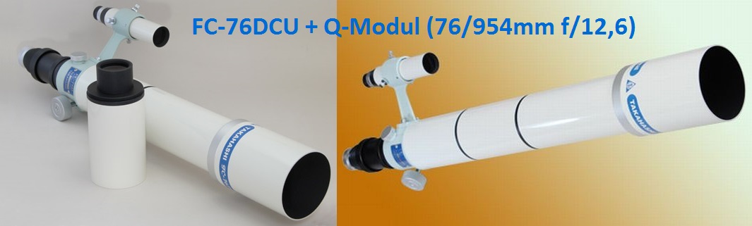 Der FC-76DCU kann auch mit dem Extender CQ 1.7x (Q-Modul, TKA20595) des FS-60CB nachgerüstet werden. Heraus kommt ein 76/954mm (f/12,6) Apo mit hervorragender Abbildungsqualität, ideal für hohe Vergrößerungen. Der Tubus verlängert sich dadurch um ca. 13cm auf knapp 80cm, das Gewicht steigt unwesentlich um 300g auf 2,2kg. Okularseitig gibt es noch drei weitere Teleextender, den Extender-Q 1.6x, eine aufwendige Optik mit 5 Linsen in 3 Gruppen, oder für lange Brennweiten die Ortho-Extender 2-fach und 4-fach, alle sind sowohl visuell, als auch fotografisch verwendbar.