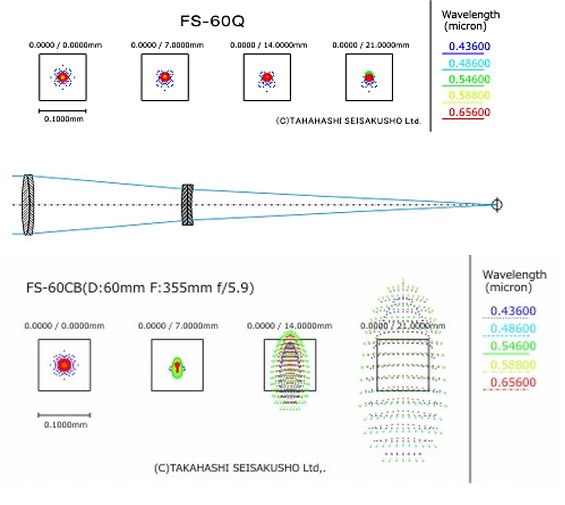 Den kompakten 60mm Fluorit Apo gibt es bereits werkseitig mit dem 1,7x Q-Modul als FS-60Q, ein 60/600 f/10 Quadruplet Apo. Optisch ist diese Version dem FS-60CB überlegen, das Q-Modul reduziert die sphärische und chromatische Aberration und ebnet zusätzlich auch das Bildfeld, beachten Sie das Spot-Diagramm des FS-60Q unten im Vergleich zum FS-60CB. Er ist aber genauso universell wie der FS-60CB, schraubt man das Q-Modul heraus, hat man ein Richfield-Teleskop, also zwei Teleskope in einem. Ohne Q-Modul und mit dem optional erhältlichen 2 Zoll-Anschluss samt 2 Zoll Zenitspiegel und Weitfeldokularen kann man über 7° tatsächliches Gesichtsfeld erreichen, man kommt somit schon in den Bereich von Ferngläsern.