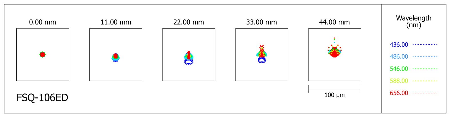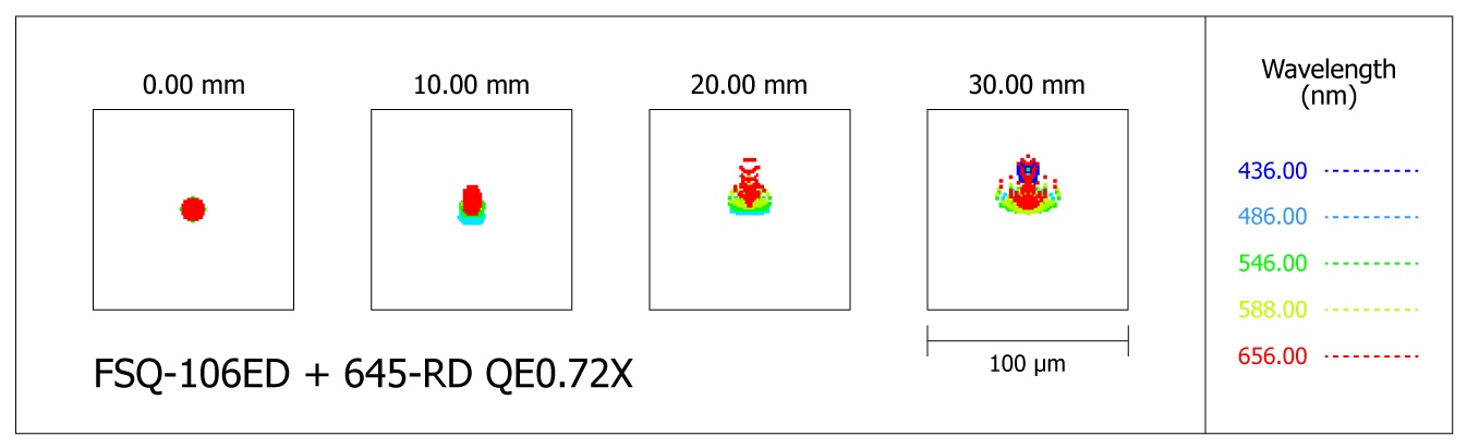 fest im Tubus verbaut und in 4 Gruppen angeordnet, bei 2 Linsen wird ein ED-Glas verwendet. Im Vergleich zum alten FSQ-106 Fluorit, konnte die chromatische Aberration nochmals reduziert werden. Auch die Sphärochromasie ist deutlich besser, er arbeitet wie auch die "langsameren" TOA-Objektive vom nahen Ultraviolett-Bereich bis ins Infrarote bei zirka 1000nm absolut zufriedenstellend. Diese höhere Korrektur wurde neben der Verwendung von den besten ED-Gläsern, unter anderem dadurch erreicht, dass die dritte Linse nun näher beim Objektiv liegt und so ein höheres Maß an Korrektur möglich ist. Sie ist 50% größer als beim Vorgänger und ermöglicht auch eine bessere Ausleuchtung.