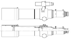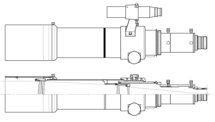 Der FSQ-85 basiert auf dem gleichen modifizierten 4-linsigen Petzval Design wie das FSQ-106ED Modell, auch hier werden zwei ED-Linsen verbaut. Die 4 Linsen sind in 3 Gruppen angeordnet, den optischen Aufbau sieht man auf der Schnittzeichnung unten. Sie zeigt die ED-Version, die in Europa erhältliche EDX-Version, ohne 2 Zoll Verlängerungshülse, dafür mit Bildfeldrotator besitzt natürlich die gleiche optische Konstruktion.