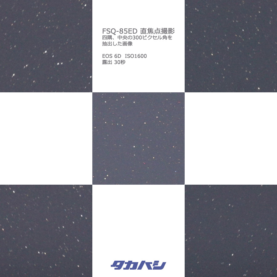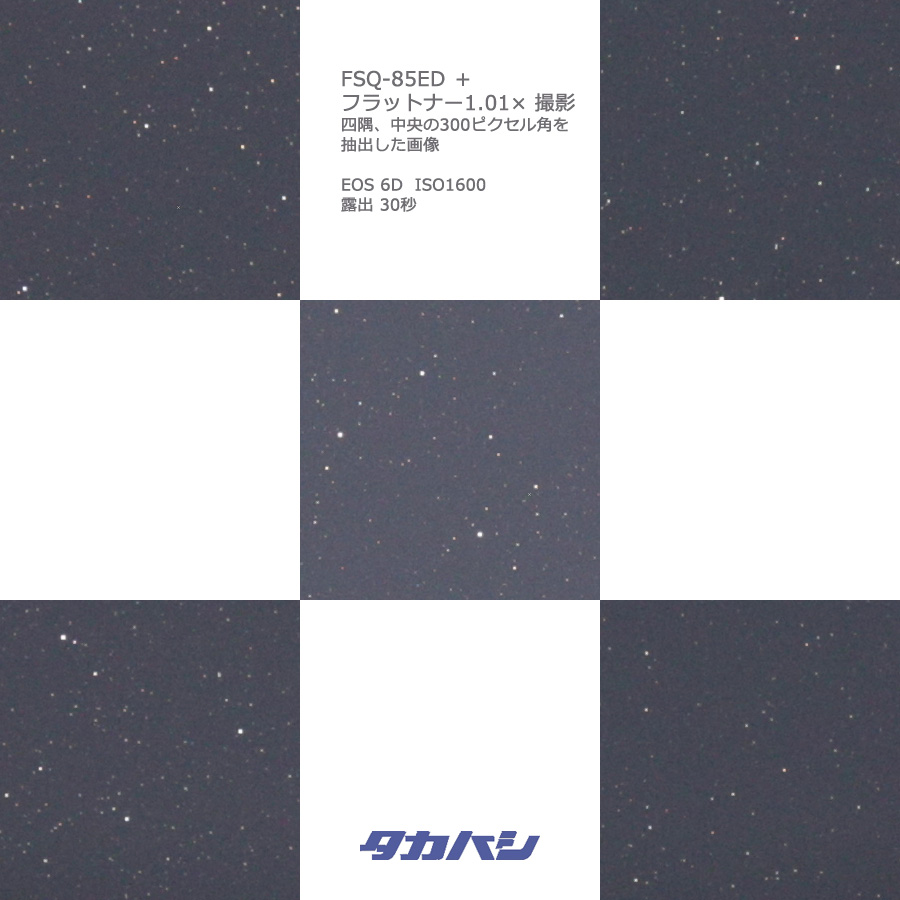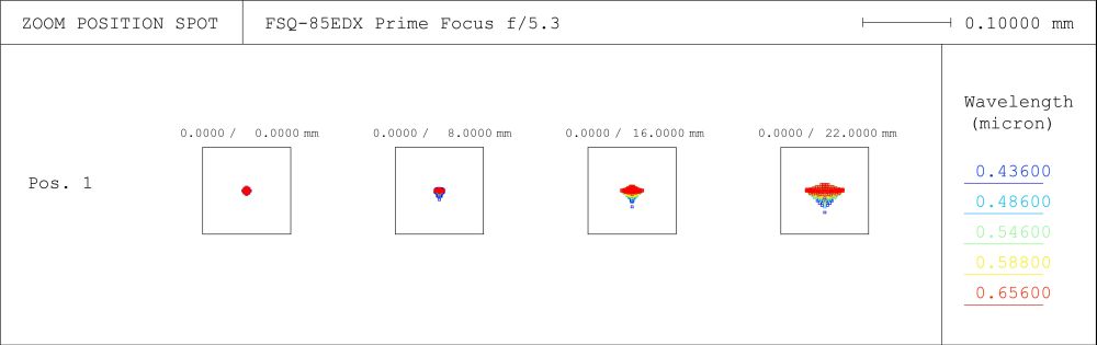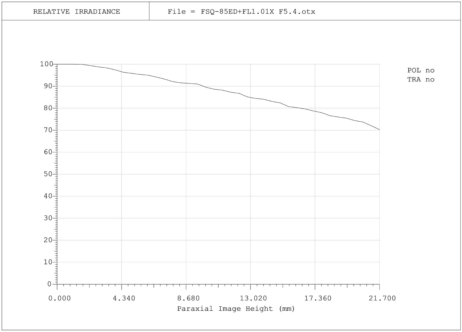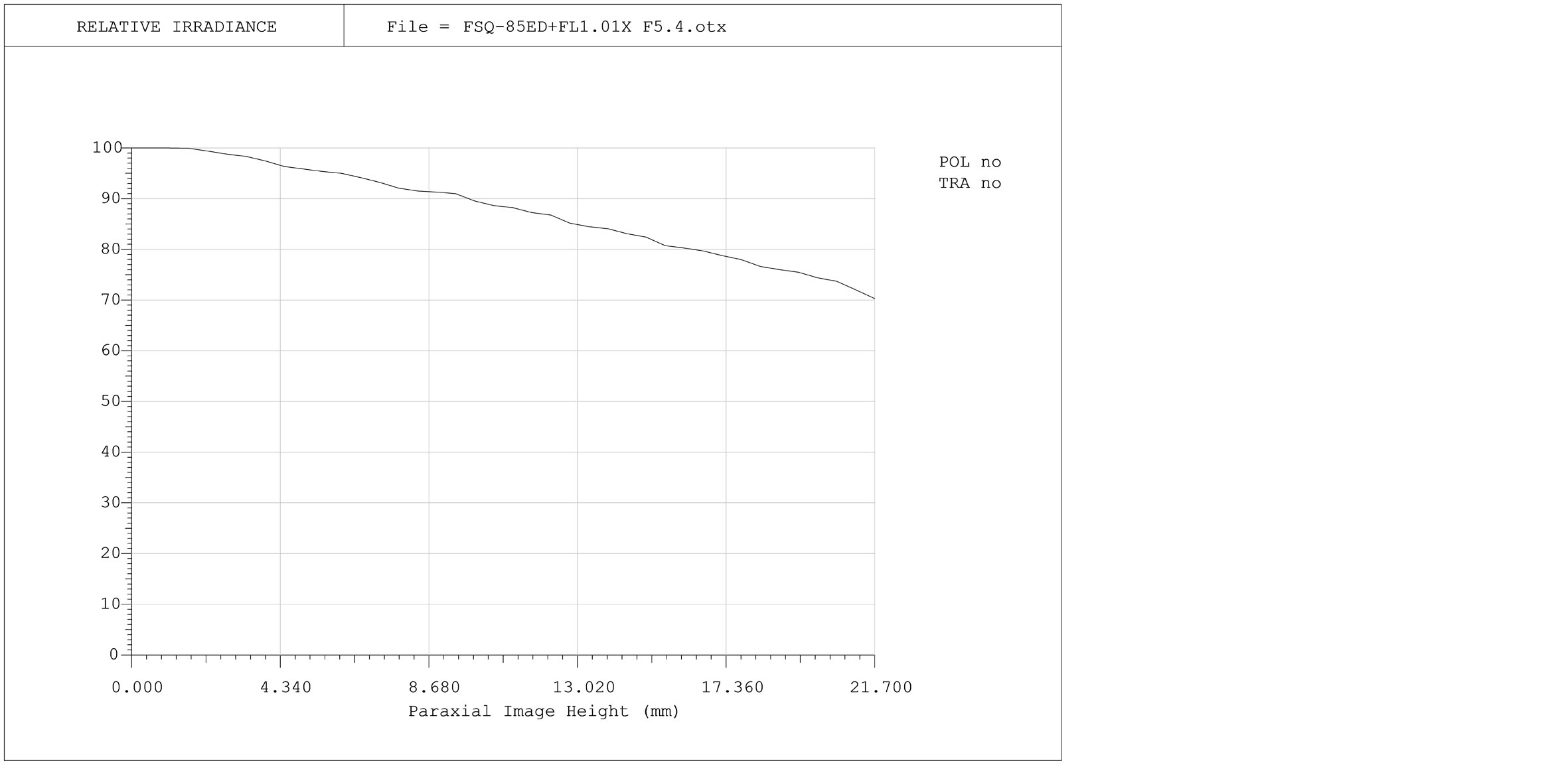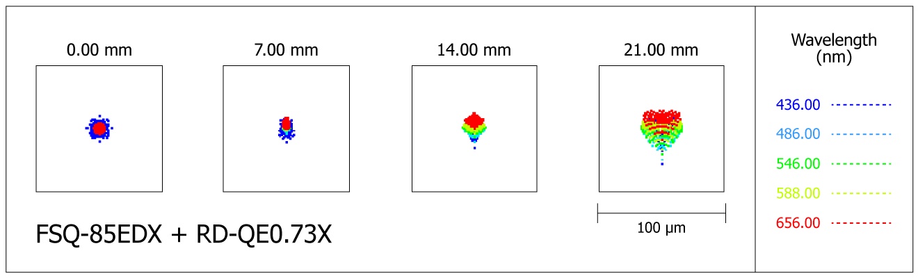 Dem ständigen Wunsch nach größeren Kamera-Chips entgegnet Takahashi mit einem neuen Flattener für den FSQ-85. Dieser belässt die Brennweite praktisch unverändert (455mm, x1.01), ebnet das Bildfeld aber weiter und korrigiert zusätzlich den Astigmatismus. So ist der kleinste FSQ auch ohne Kompromisse Vollformat-tauglich, auch bei sehr kleinen Pixeln, beachten Sie dazu auch die Spot-Diagramme sowie die Vergleichsaufnahmen weiter unten.