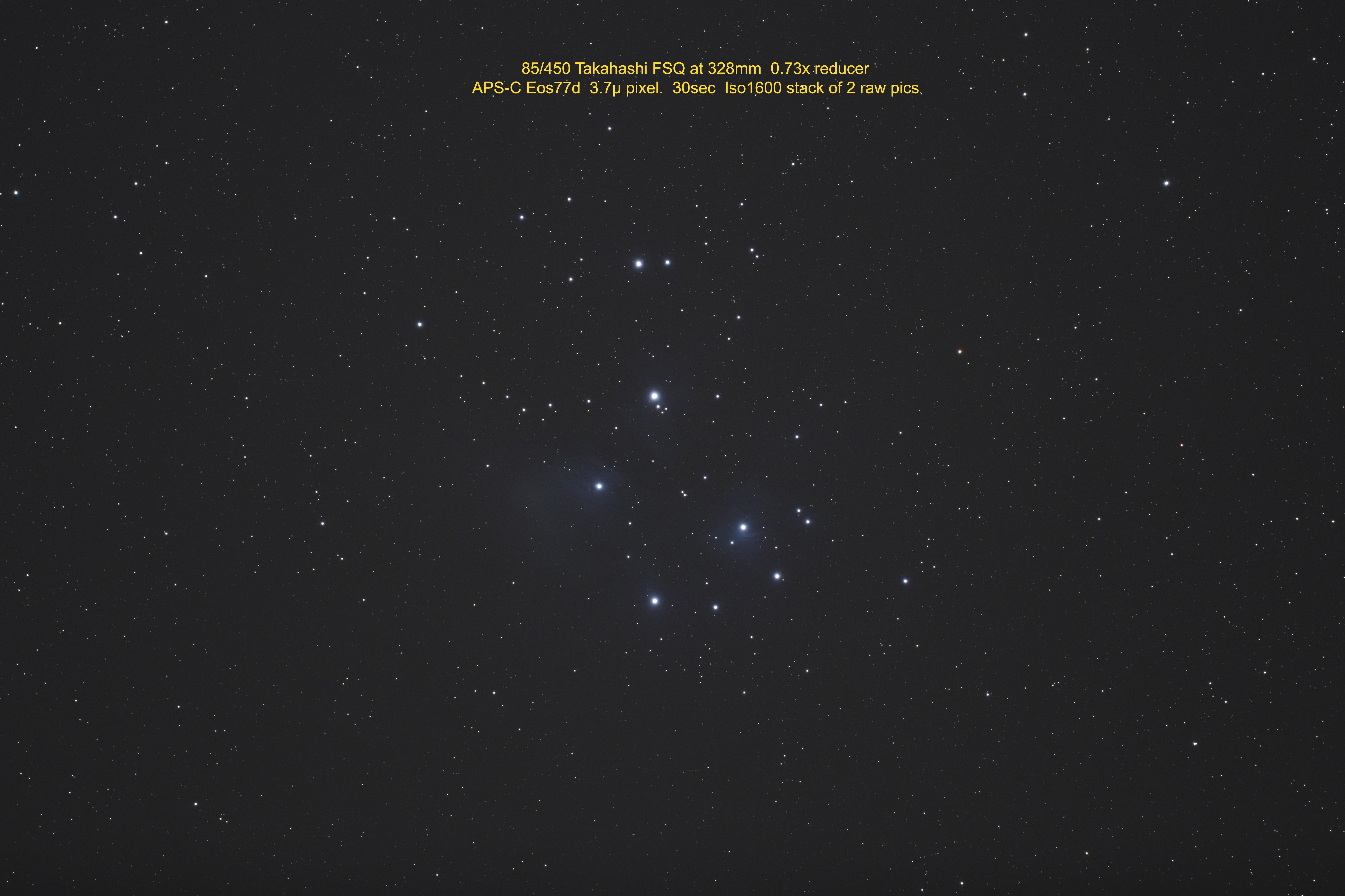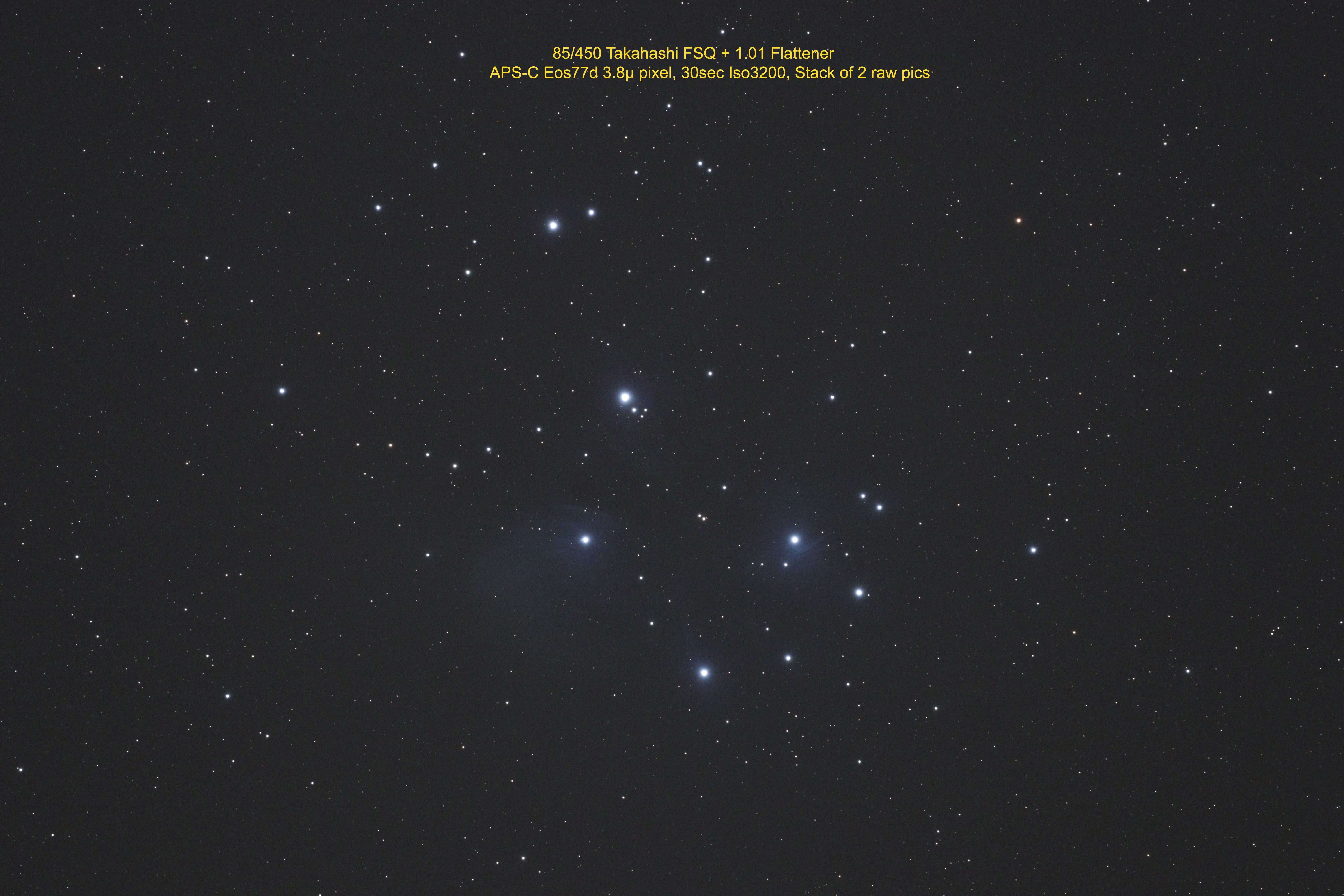 Bei den Fotos unten finden Sie Testbilder mit der Vollformat EOS6D sowie mit der kleinpixeligen EOS77D (APS-C) - Bilder direkt aus der Kamera. Sowohl für den FSQ85 + Flattener, als auch für FSQ85 + 0.73x Reducer. Rechtsklick auf das kleine Bild und "in neuem Tab anzeigen" zeigt volle Größe!