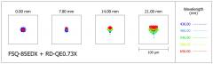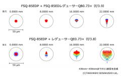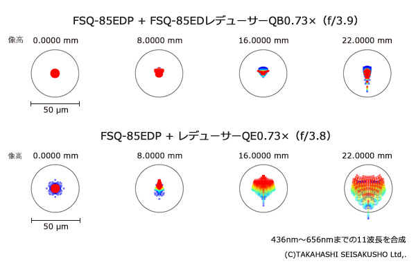 Dem ständigen Wunsch nach größeren Kamera-Chips entgegnet Takahashi mit einem neuen Flattener für den FSQ-85. Dieser belässt die Brennweite praktisch unverändert (455mm, x1.01), ebnet das Bildfeld aber weiter und korrigiert zusätzlich den Astigmatismus. So ist der kleinste FSQ auch ohne Kompromisse Vollformat-tauglich, auch bei sehr kleinen Pixeln, beachten Sie dazu auch die Spot-Diagramme weiter unten.