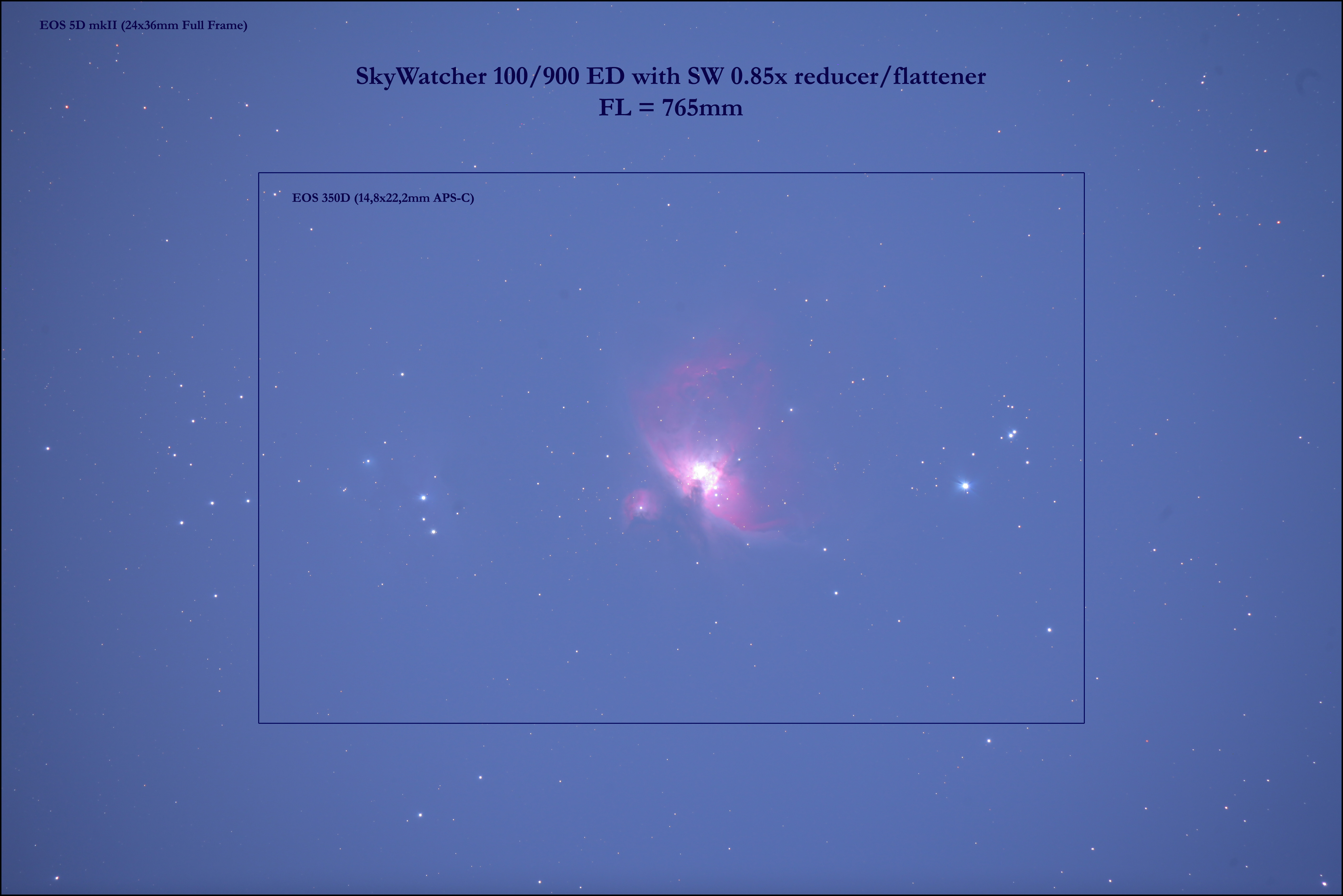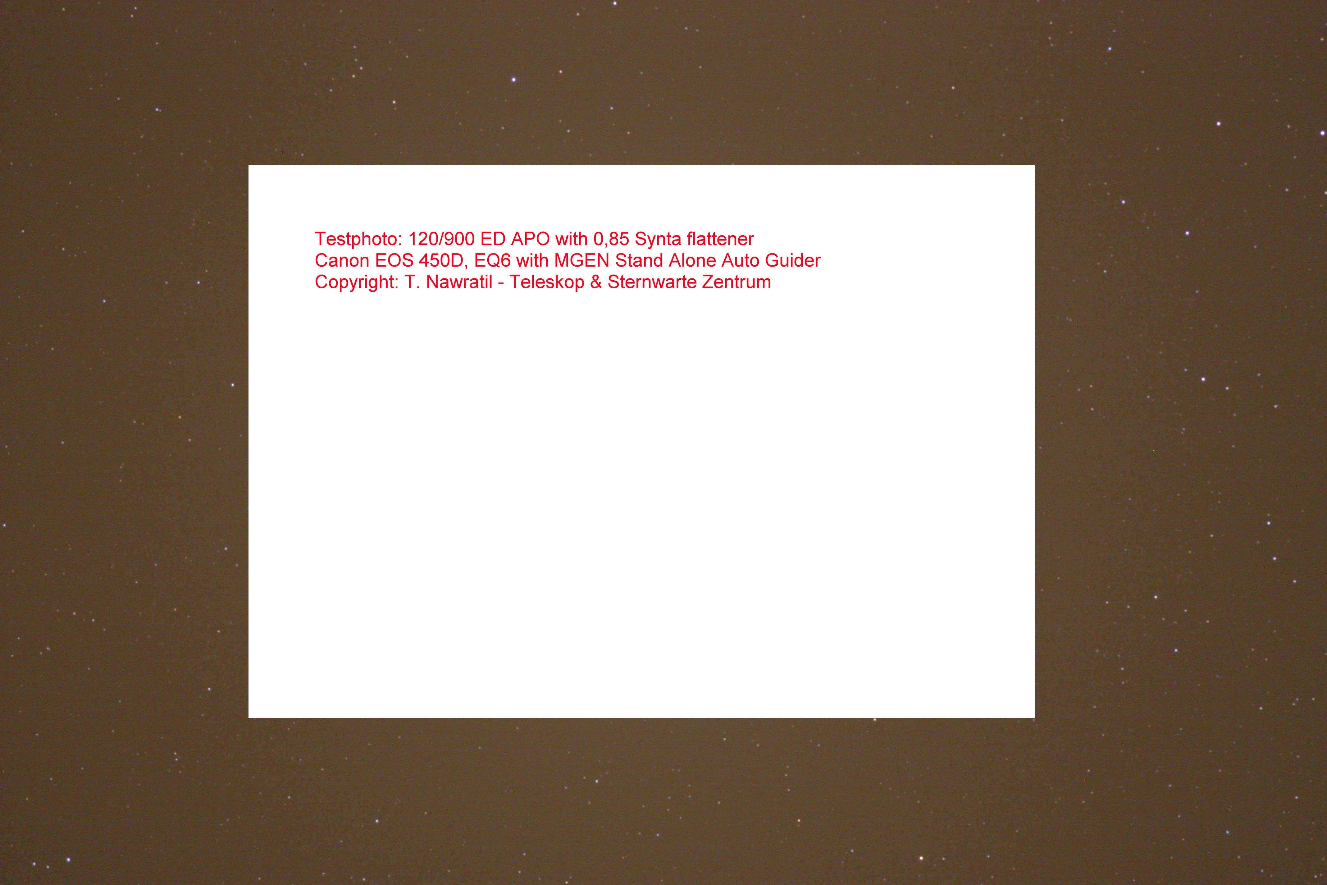 Durch Verwendung dieses Reducers mit einem 100/900mm ED-APO erhält man einen 100/765mm mit perfekter Randkorrektur, bzw. mit dem 80/600mm-ED einen 80/510mm mit sehr guter Randkorrektur (siehe Testfotos) und 1,75 x 2,6 Grad Gesichtsfeld (Bilddiagonale ist über 3 Grad!).