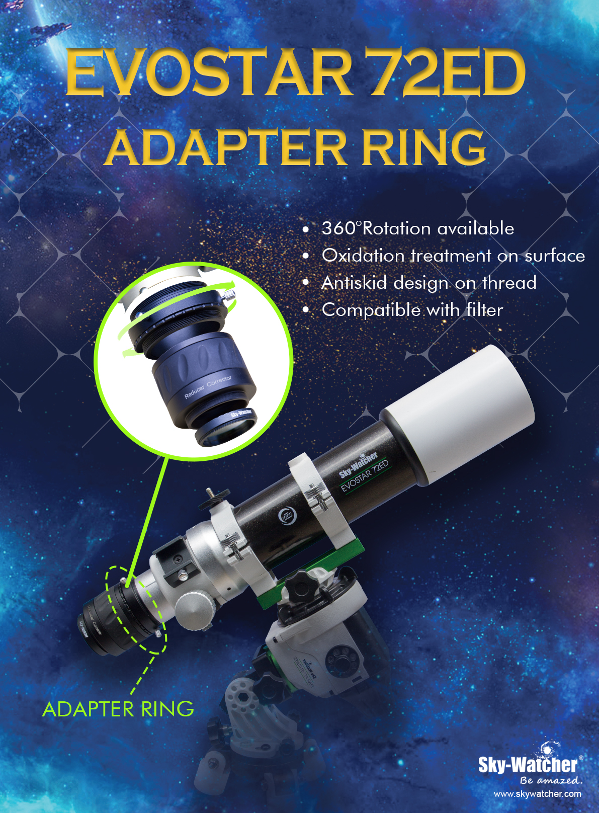 SkyWatcher Rotationsadapter für den 72/420 Black Diamond Apo und den dazu passenden 0,85x Reducer/Korrektor. Er ermöglicht das einfache Drehen der Kamera samt Reducer, somit kann der Bildausschnitt leicht an das Himmelsobjekt angepasst werden, geklemmt wird mit drei Rändelschrauben auf einen Konus.