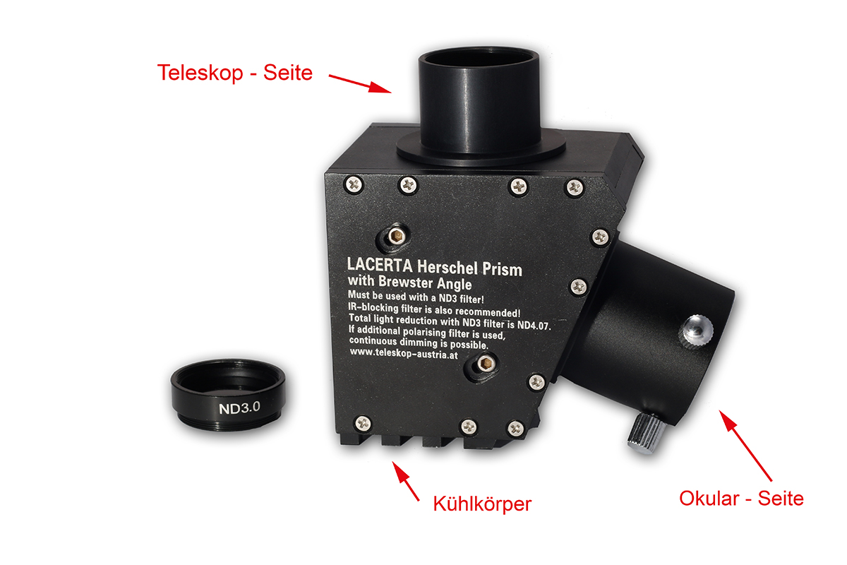 - Beachten Sie bitte, dass die optischen Elemente strikt die folgende Reihenfolge haben müssen: Teleskop - Herschel Prisma - ND3 Filter - Polarfilter - Zusatzfilter (z.B. UV/IR Block oder Kontrastfilter nach Wahl) - Okular (oder Kamera)