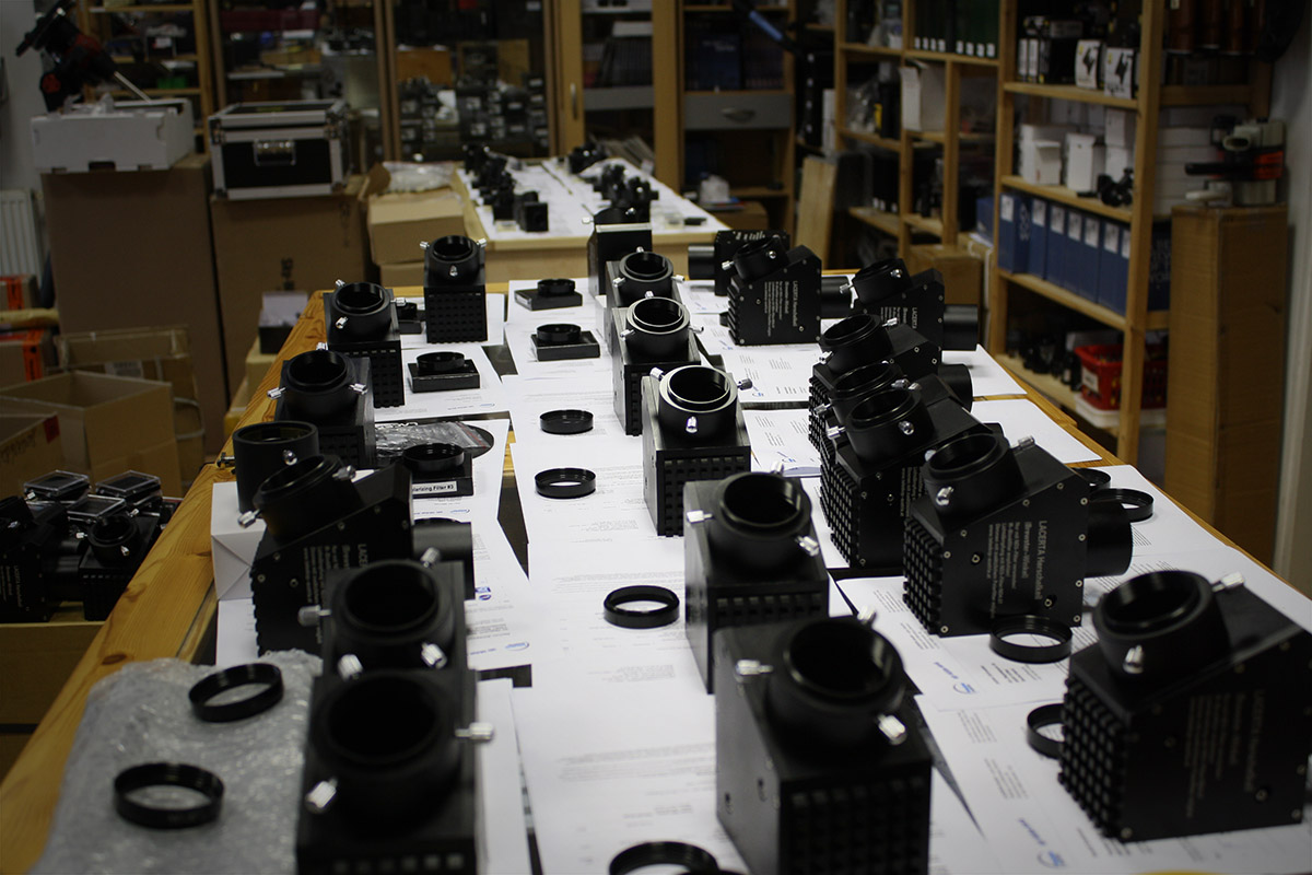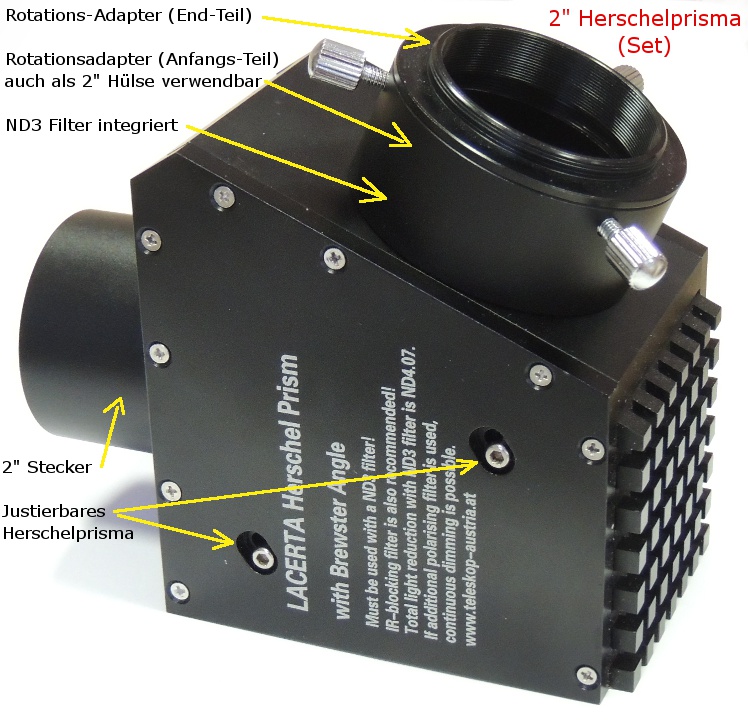 - Beachten Sie bitte, dass die optischen Elemente strikt die folgende Reihenfolge haben müssen: Teleskop - Herschel Prisma - ND3 Filter - Polarfilter - Zusatzfilter (z.B. IR Block oder Kontrastfilter nach Wahl) - Okular (oder Kamera)
