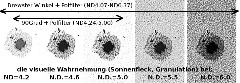 Die visuelle Wahrnehmung bei verschiedenen Neutralen Dichten zeigt das Bild unten. Es ist gut zu sehen, dass die Granulation bei traditionellen Herschel Prismen nur mit einem zusätzlichen DRITTEN Filter (ND3 und Polfilter sind vorausgesetzt!) gut beobachtbar ist. Herschel Prismen mit Brewster Winkel brauchen keinen zusätzlichen Filter, weil der Dimmbereich hier kontinuierlich bis ND6.37 möglich ist!