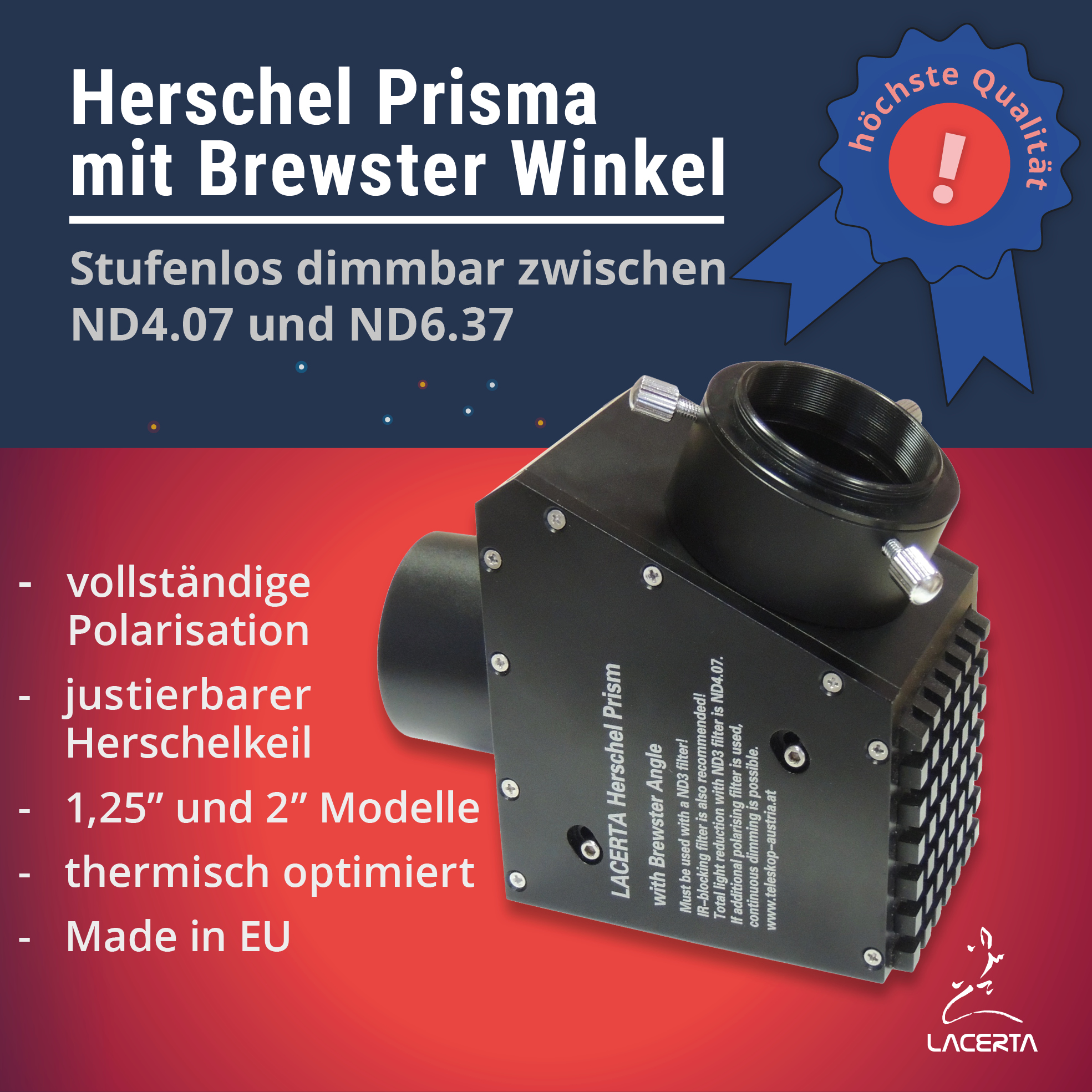 Die LACERTA Herschel-Prismen unterscheiden sich von den anderen am Markt befindlichen Herschel-Prismen (INTES, LUNT, Scopium usw...). Sie ermöglichen die volle Polarisation im Brewster Winkel, entgegen der einfacher herstellbaren 90-Grad Versionen, wo nur eine Teilpolarisation möglich ist.