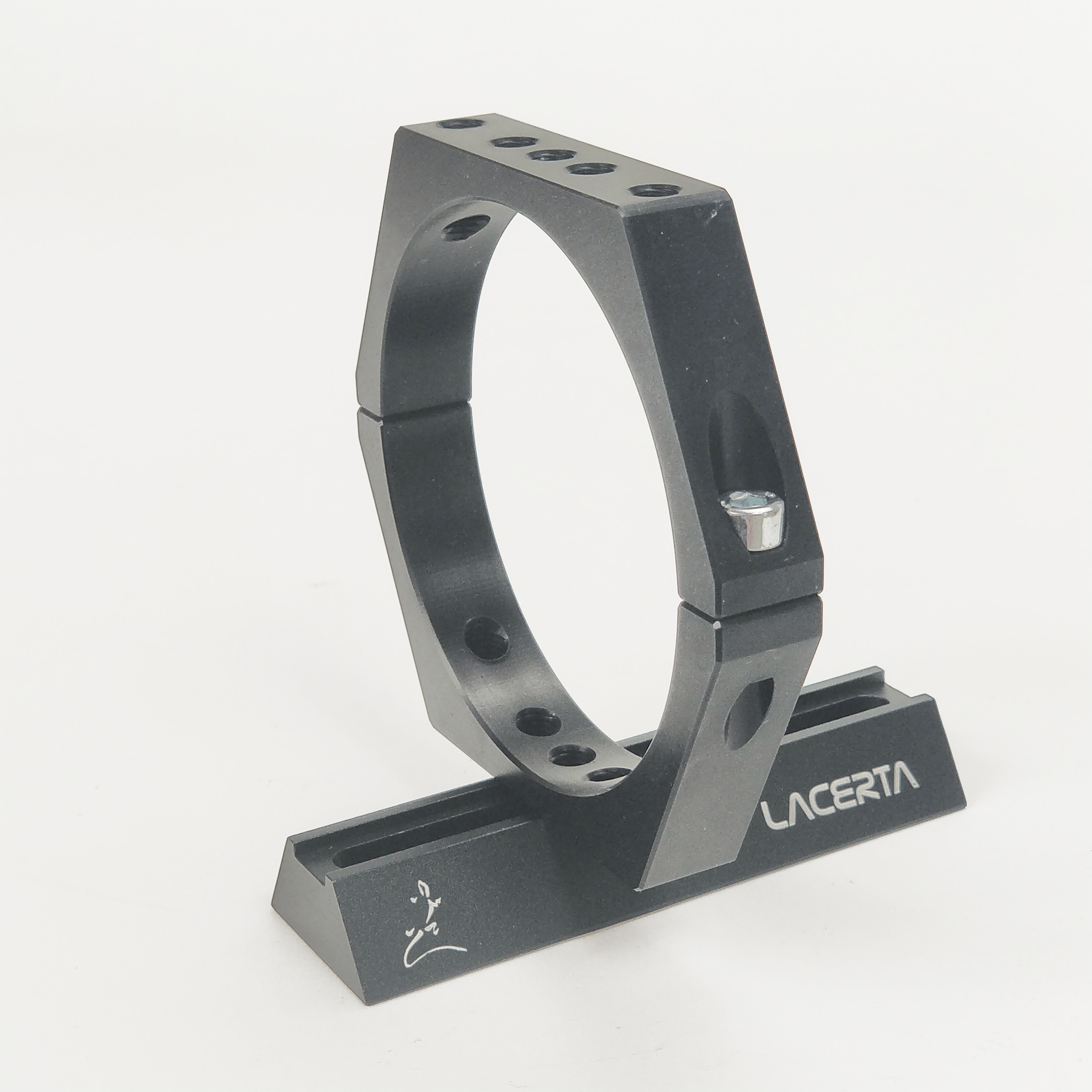 Diese Halterung passt zu gekühlten Astrokameras mit 86mm Gehäusedurchmesser (z.B. viele ZWO oder ähnliche Modelle). Als montierungsseitige Befestigungseinheit wird eine Verbindung zur Arca Swiss, oder standard Sucherschuhe oder Vixen/Celestron/SW Prismenschiene (alle 3 erhältlich in verschiedene Längen) montiert. Dadurch kann die Kamera direkt an Fotostative, Sucherschuh oder Prismenklemme befestigt werden - wie es zu Ihren Equipment am bestens geeignet ist. Die Halterung ist 15mm breit - breit genug um die Kamera halten zu können, jedoch schmall genug um die seitliche Öffnung(en) für die Kühlung frei wirken lassen. Mit einem optionalen Invers- (oder negativ-) Kameraadapter können Objektive von DSLR oder MILZ Fotoapparate angeschlossen werden.