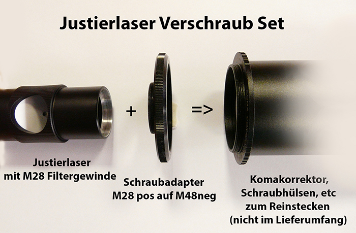 Justierlaser mit 1,25" Filtergewinde innen und Adapter, um auf 2" Filtergewinde aussen aufschrauben zu können. Passt auf Komakorrektoren wie GPU oder auf M48 Schraubhülsen.