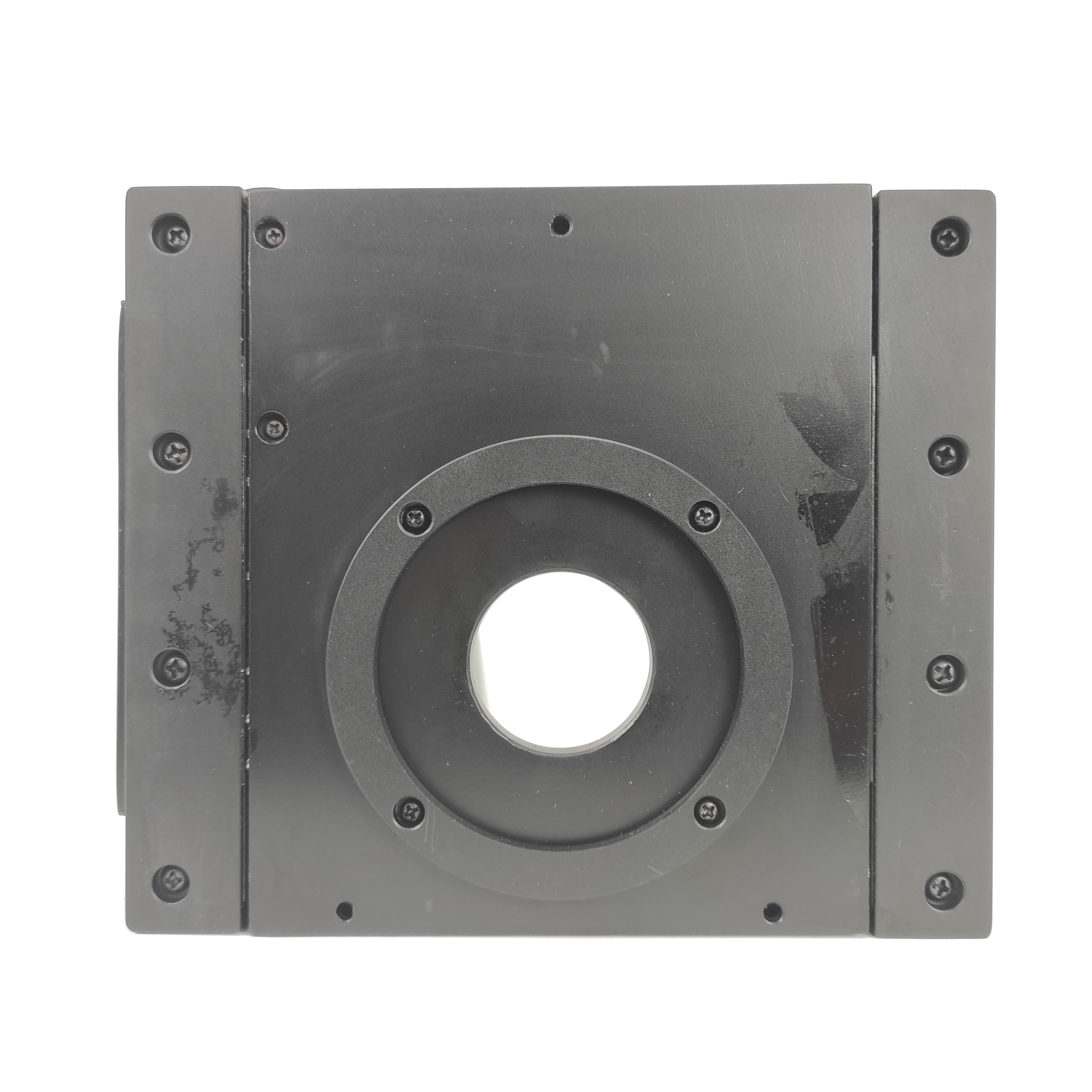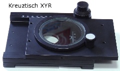 Einer der Kreuztische hat eine viereckige Glasplatte mit zwei Metallklammern, womit sich das Präparat leicht fixieren lässt. Diese Möglichkeit fehlt bei dem Modell mit einer runden Glasplatte, dafür hat es eine weitere Verstellschraube mit der die Platte rotiert werden kann.