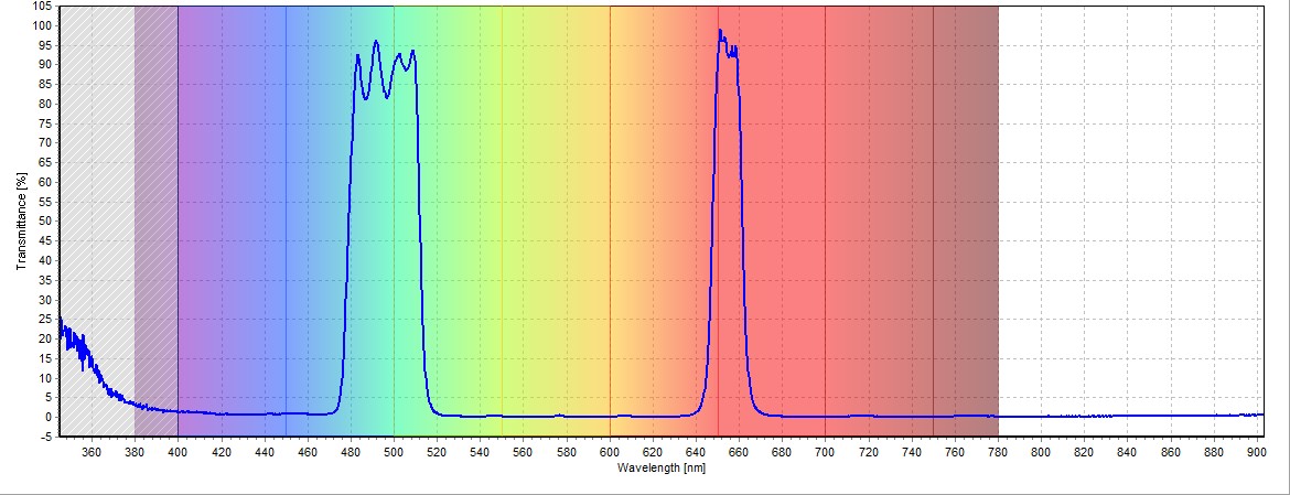 Der neue L-DualBand Filter wurde entwickelt, um möglichst effektiv Schmalbandaufnahmen mit Farbkameras betreiben zu können. Eine übliche Bayermatrix filtert das einfallende Licht nach Rot/Grün/Blau und da kam die Idee, dies mit einem Schmalbandfilter welcher nur die beiden Linien passieren lässt zu kombinieren. Das rote H-Alpha Licht wird von den roten Pixeln, das blaugrüne OIII Licht von den blauen und grünen, und das eher bläuliche H-beta Licht ausschliesslich von den blauen Pixeln erfasst. So kann man mit einer einzigen Aufnahme sowohl H-Alpha als auch O-III und H-beta erfassen. Wegen der erhöhte Brandbreite von etwa 30nm, werden die Sterne auch nicht gefressen und das Filter wirkt, wie eine Emissionsnebel-betonte L-Filter. Es ist eine gute und vor allem preiswerte Alternative für L-PRO, IDAS oder L-eNhance Filter. Man kann das als ganz normales Farbbild weiterverarbeiten, oder aber mit geeigneter Software die Kanäle doch getrennt auslesen und so reine nicht debayerte Schmalbandbilder erhalten (zB mit dem Prozess SplitCFA in PixInsight).
