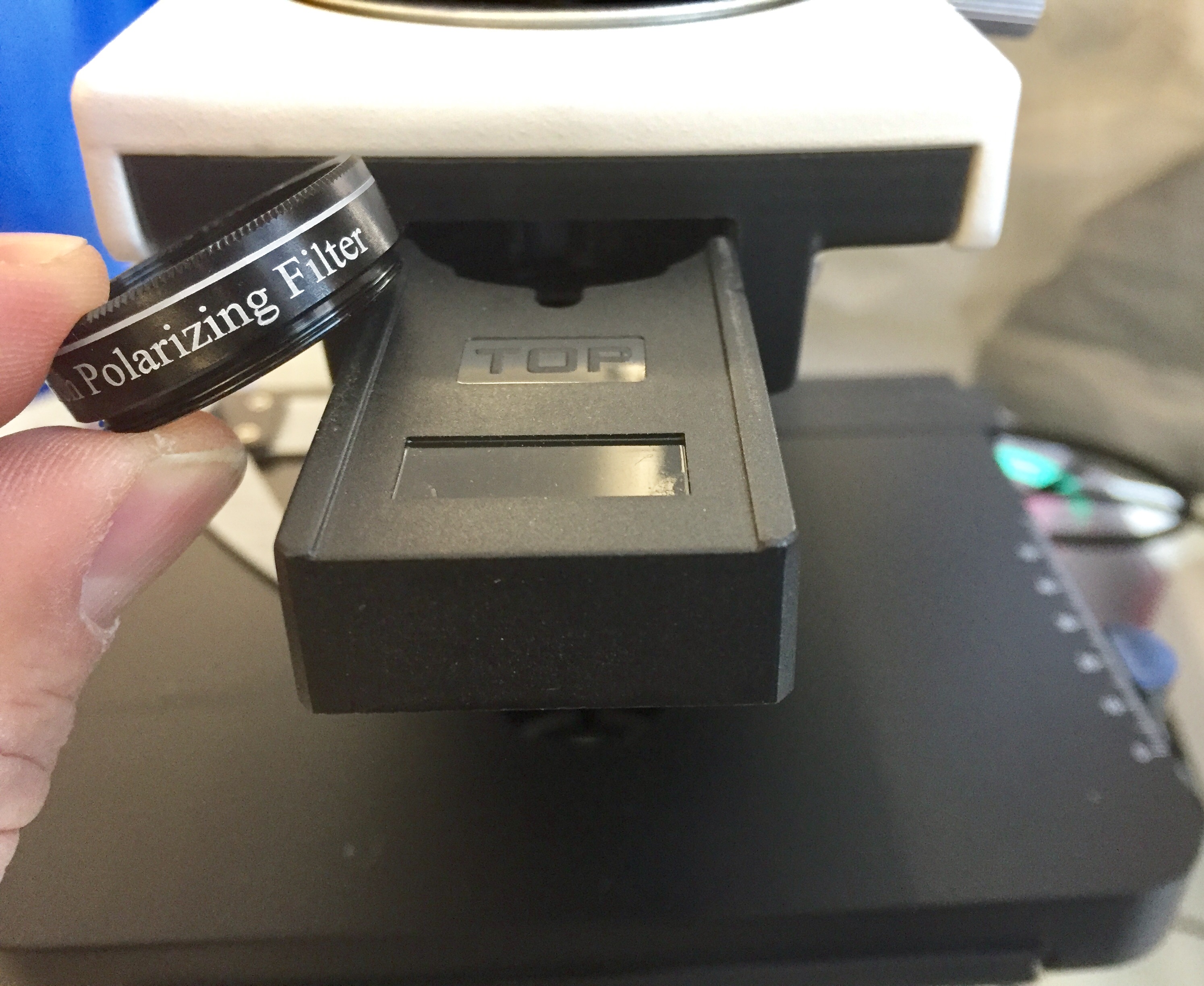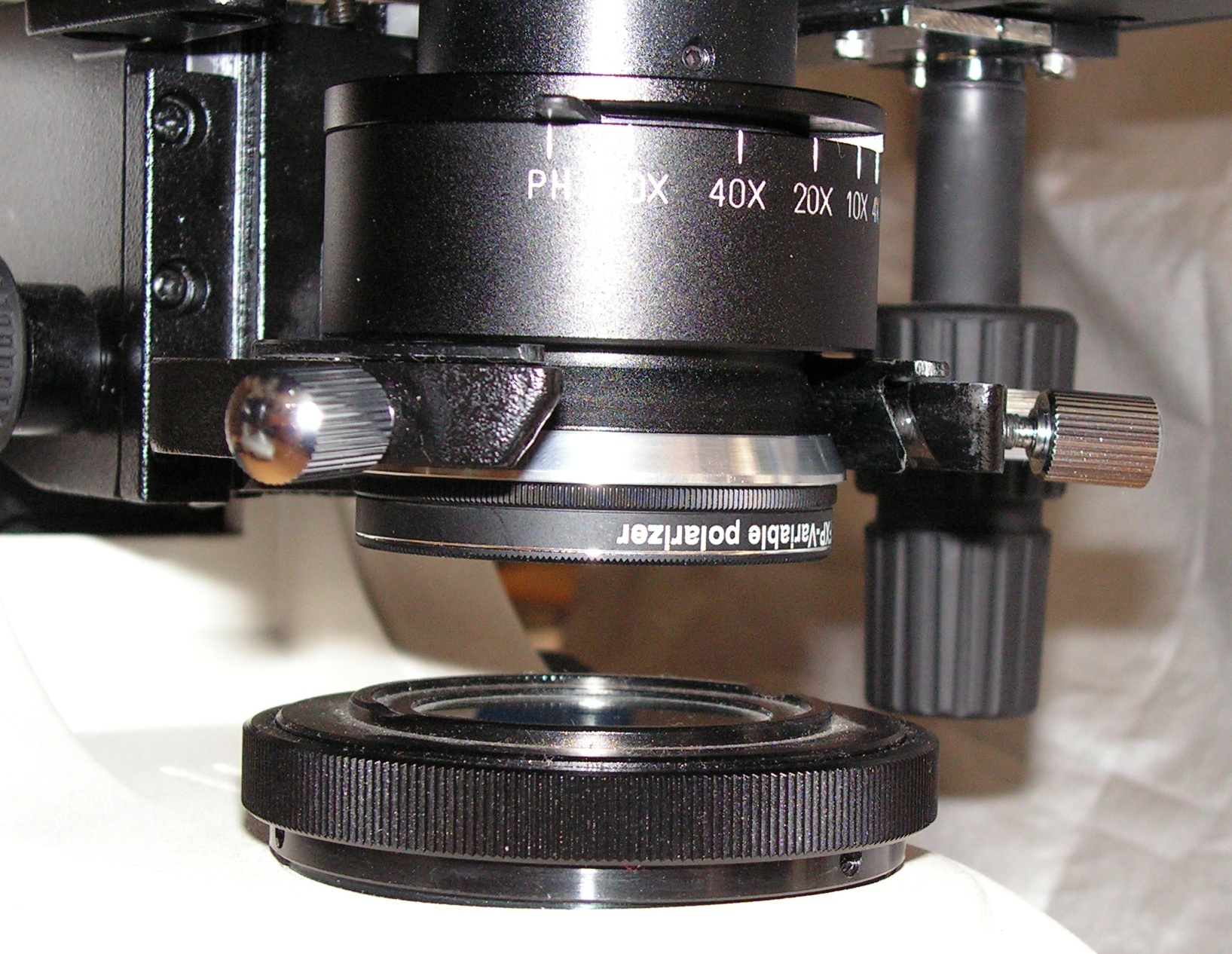 Vorerst ein klein wenig Theorie: Polfilter lassen nur Licht mit einer bestimmten Schwingungsrichtung durch. Viele Minerale haben die Eigenschaft, die Schwingungsebene des Lichts zu drehen: Sie werden als "optisch anisotrop" oder "doppelbrechend" bezeichnet. Zur Untersuchung dieser Mineralien und Gesteine werden Dünnschliffe angefertigt. Diese werden vor dem Mikroskopobjektiv zwischen zwei Polfiltern platziert, wobei der zweite Polfilter um 90 Grad gegenüber dem ersten Filter gedreht ist (sog. gekreuzte Polarisatoren). Bei Mikroskopen ist der zweite Polfilter im Polarisationsokular eingebaut. Dieser Aufbau ermöglicht viele interessante Untersuchungen. Durch Drehen des Polarisationsokulars werden doppelbrechende (anisotrope) Strukturen sichtbar - isotrope bleiben dunkel. Dank der Interferenzerscheinungen sieht man farbige Strukturen, wenn man das Objekt dreht. Somit kann man viele Informationen über die Zusammensetzung des Objektes (Gestein oder Texturen von Flüssigkristallen) gewinnen.