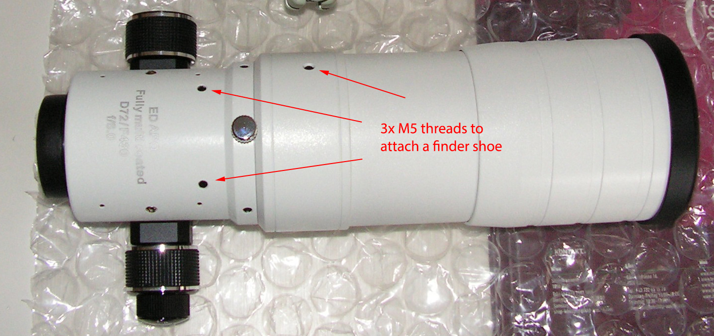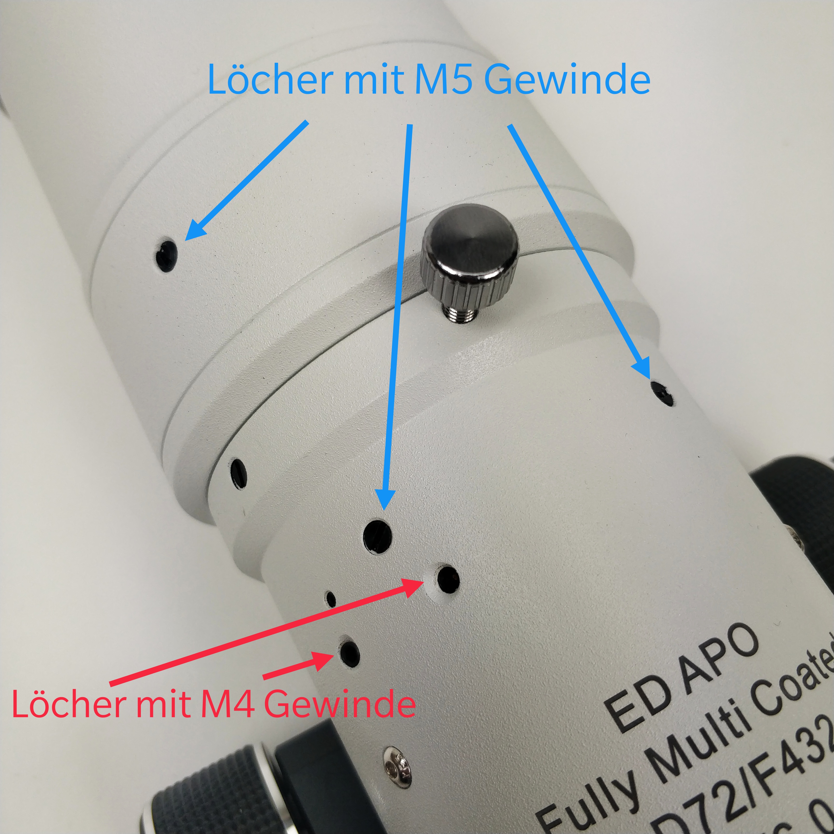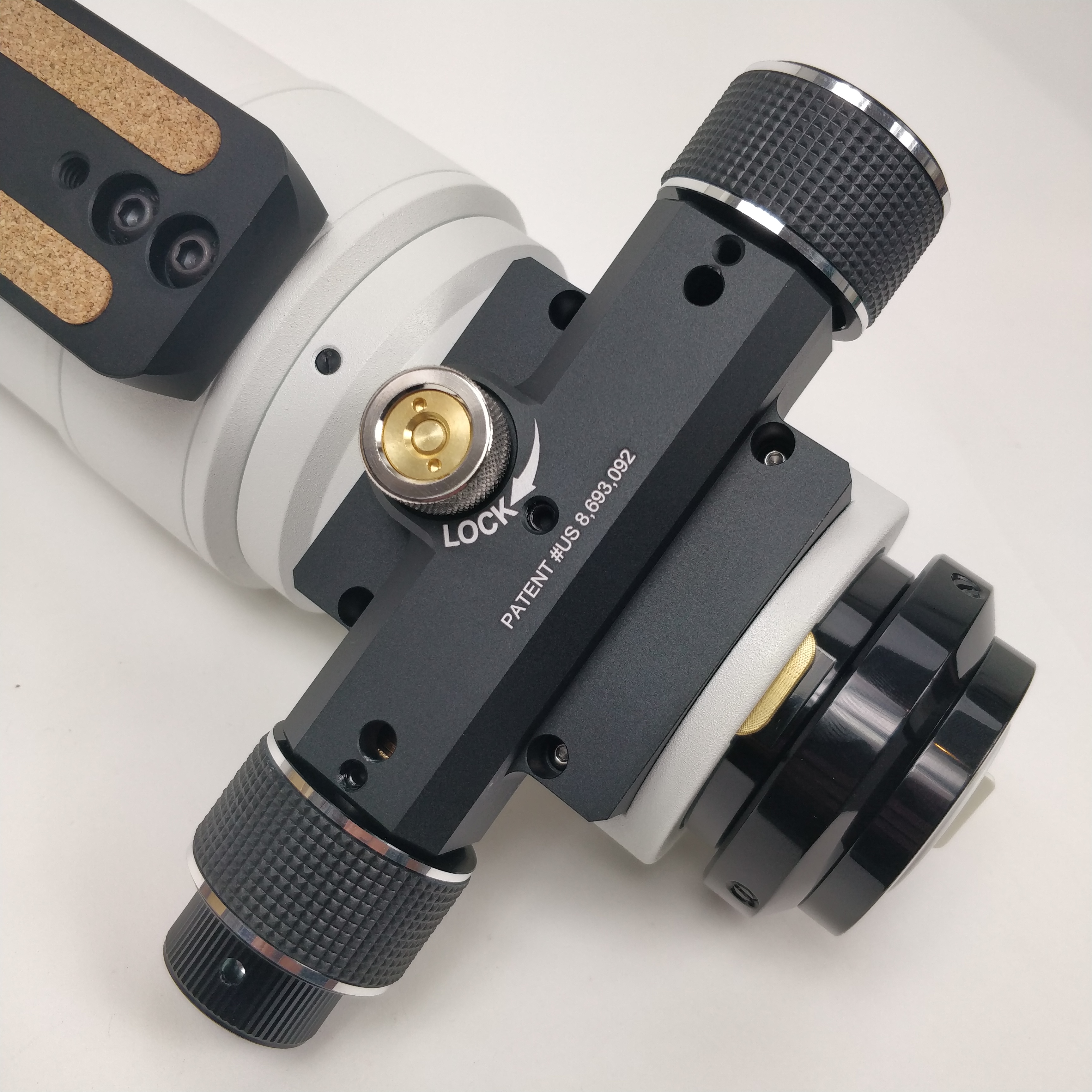 Der "Fuß" des Lacerta 72/432 ist mit 2x M6 Schrauben an der Unterseite befestigt. Sie können den Fuß abschrauben und umdrehen, um bessere Balance zu ermöglichen. Zum Klemmen an einer Montierung drehen Sie den Fuß um und verdrehen den Okularauszug so, dass die Fokussiereinheit links oben und der SucherSchuh mit Guidescope rechts oben positioniert sind. Mit einem Rotator des Flatteners können Sie den Bildausschnitt an der Kamera rotieren und einstellen.
