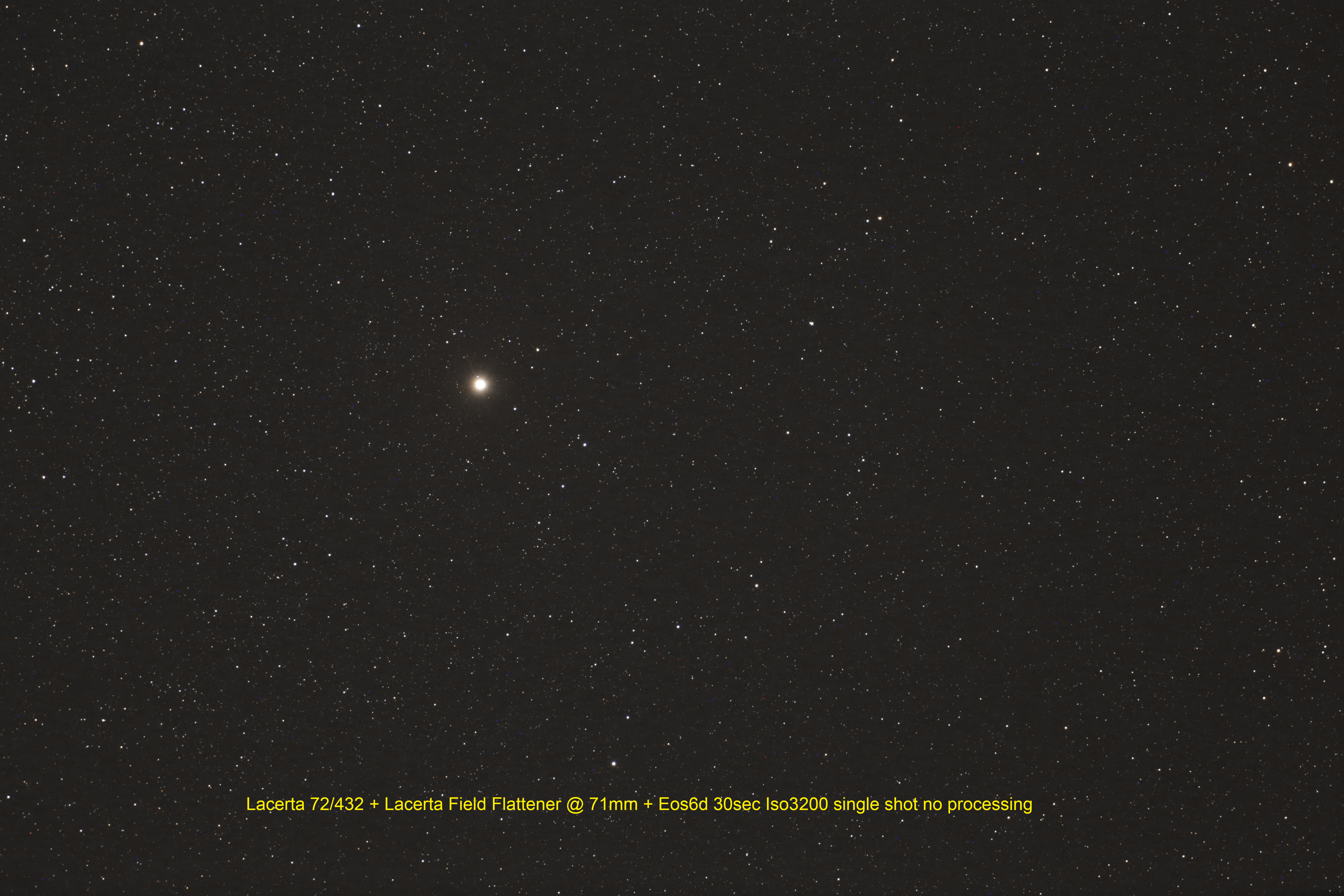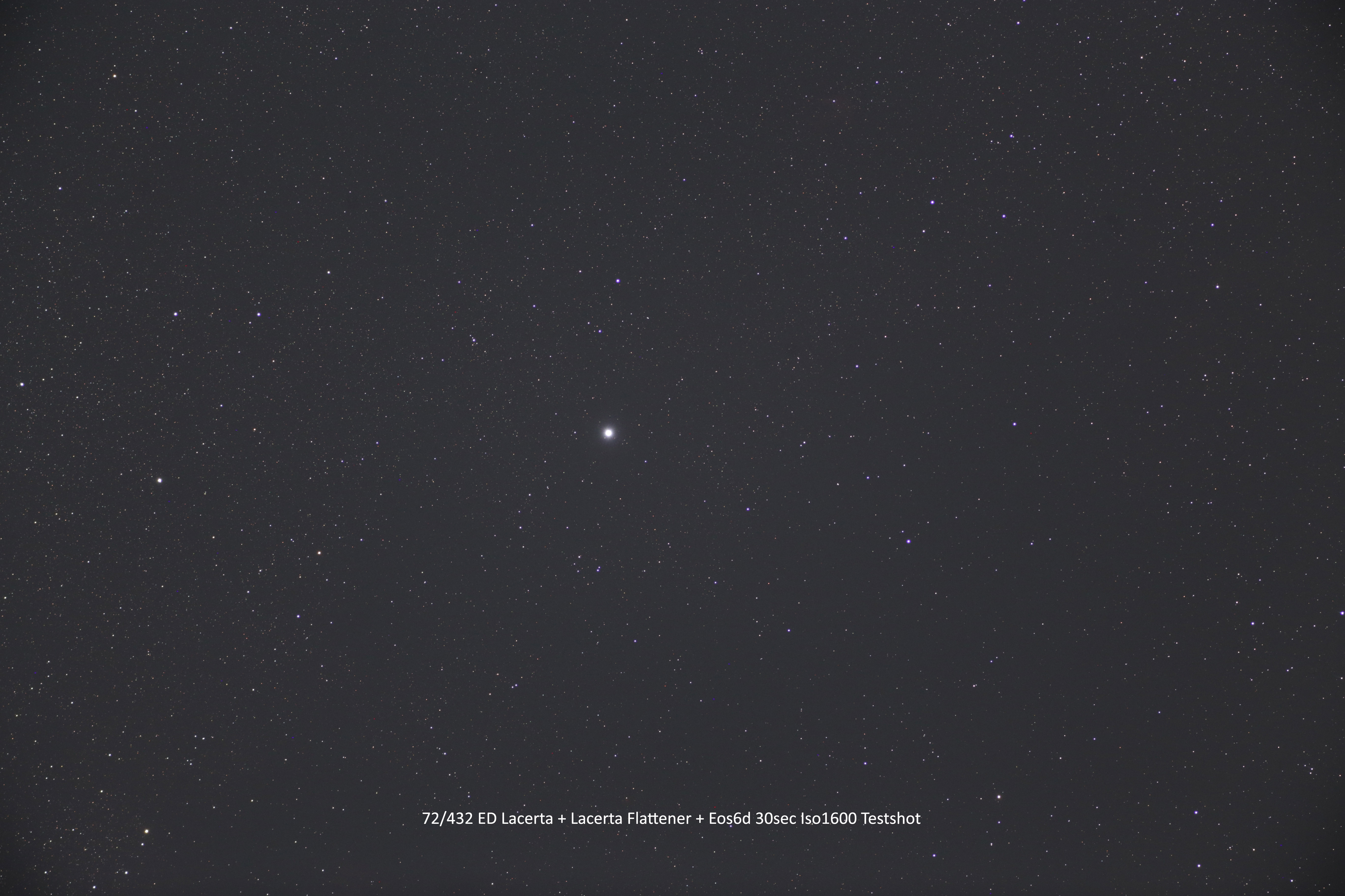 Der Lacerta 72mm ED-APO schließt die Lücke zwischen den preiswerten ED-Doublets und den teureren und schwereren Triplet Apochromaten. Astrofotografen die Wert auf eine besonders farbreine Abbildung legen, sind mit diesem APO bestens bedient. Das zweilinsige ED Objektiv wurde mit einem ebenfalls 2-Linsigen Bildfeldebner kombiniert: diese vierlinsige Kombination ebnet weit mehr als einen APS-C Format (siehe unbearbeitetes Testfoto mit einem Canon EOS 6D Kamera). Noch besseres Resultate bekommt man für Fullformat mit dem LWD-Flattener (siehe dort).