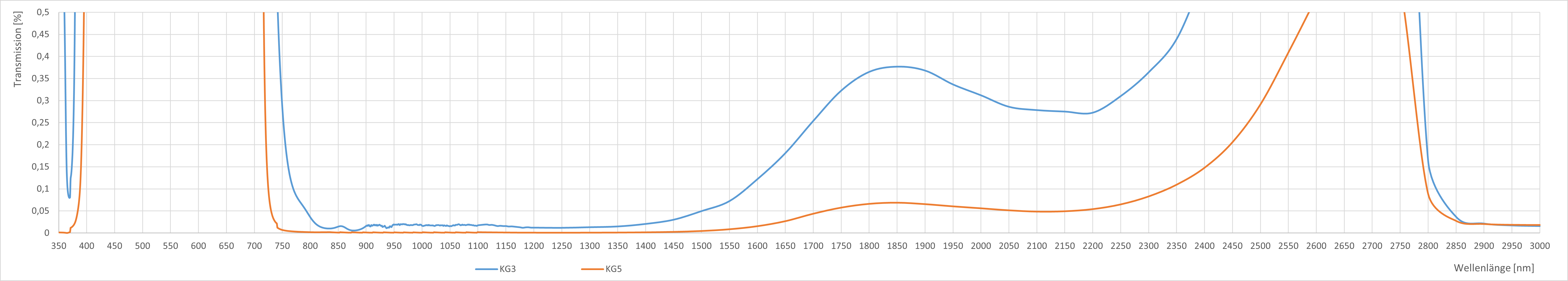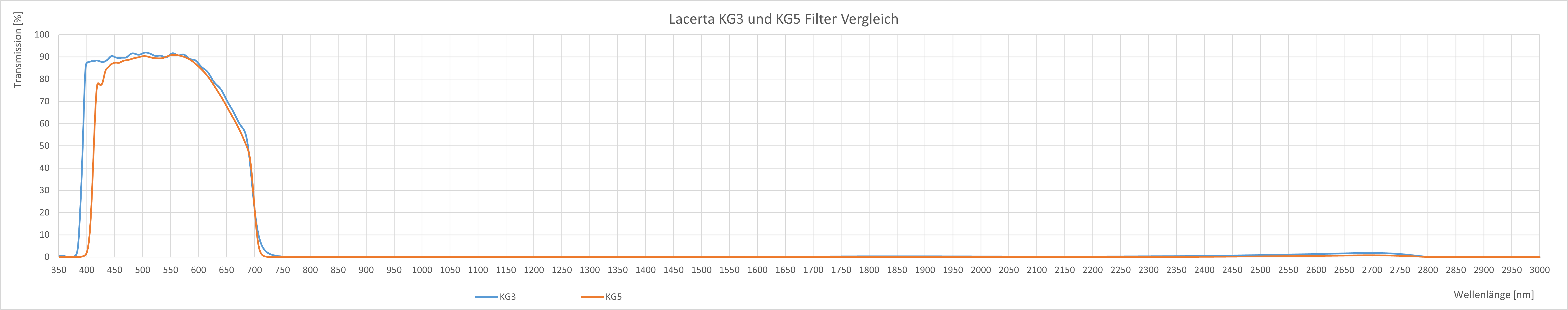 Der LacertaKG3 Filter hat eine Transmission von weniger als 0,05 % zwischen 800 nm und 1500 nm. Der neue KG5-Filter hingegen erreicht eine Transmission von 0,001 % in einem viel breiteren Bereich zwischen 760 nm und 2200 nm. Somit dämpft der KG5 im Vergleich zum KG3 etwa 50-mal besser und der Bereich ist etwa doppelt so groß (700 nm im Vergleich zu 1440 nm). Auch im UV-Bereich beginnt der KG5-Filter früher zu dämpfen. (T<0,5 % unter etwa 400 nm)