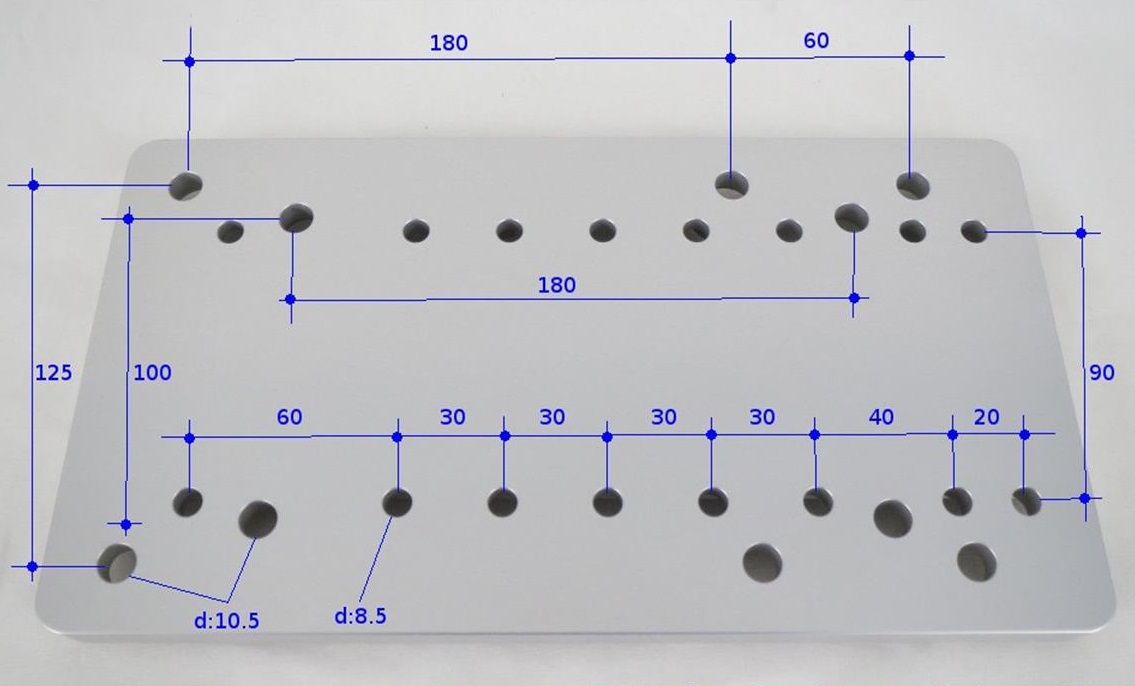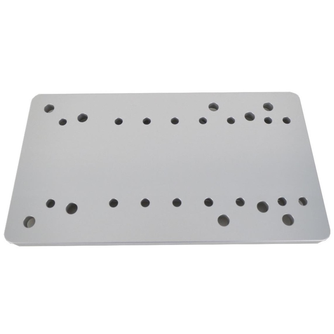 Es sind jedoch auch mehrere Bohrungen für Rohrschellen mit 90mm Lochabstand vorhanden, daher ist diese Schiene auch für die kleineren Takahashi Teleskope mit Doppelrohrschellen geeignet, beachten Sie dazu das Bild mit den Lochabständen.