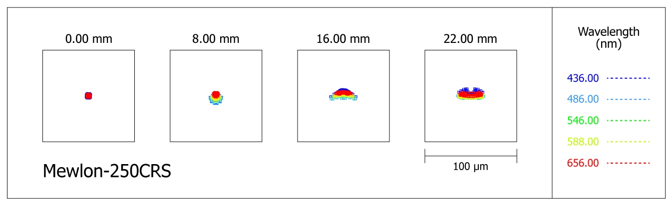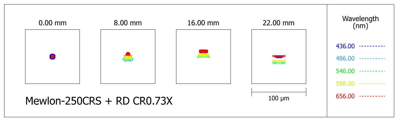 CRS-Geräte im Blendrohr einen Korrektor mit 3 Linsen in 3 Gruppen (1 Linse aus ED-Glas) und sehr großen Linsenabständen, der die Brennweite auf f/10 reduziert. Dieser Korrektor beseitigt den Koma-Fehler komplett aus dem System, ohne die Abbildung auf der optischen Achse zu verschlechtern. Außerdem wird das Bildfeld geebnet, am Rande eines Bildkreises mit 35mm Durchmesser sind die Spots nicht größer als 15 Mikrometer, ein Mewlon-CRS übertrifft ein herkömmliches Ritchey-Chrétien Teleskop.