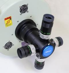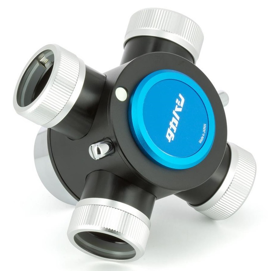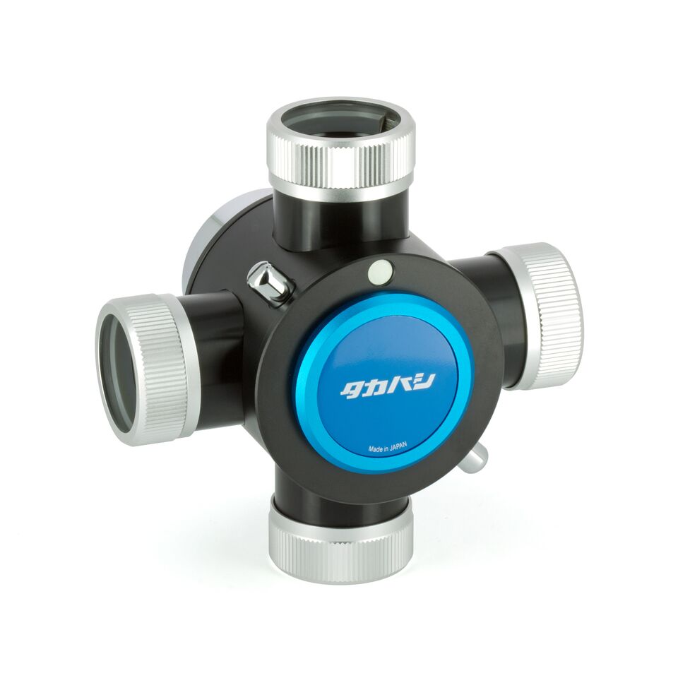 Der neue Okularrevolver von Takahashi ermöglicht das rasche Wechseln zwischen den verschiedenen 1,25-Zoll-Okularen oder einer Planetenkamera. Er passt an die meisten Teleskope mit 2 Zoll Anschluss, das Besondere ist der relativ kurze Lichtweg von nur 81mm, die Umlenkung des Lichtes erfolgt mit einem Prisma. Es stehen vier Anschlüsse für 1,25" Okulare zur Verfügung, die Klemmung erfolgt mit selbst-zentrierenden Spannringen, die mechanische Verarbeitung ist hervorragend und genügt auch höchsten Ansprüchen.
