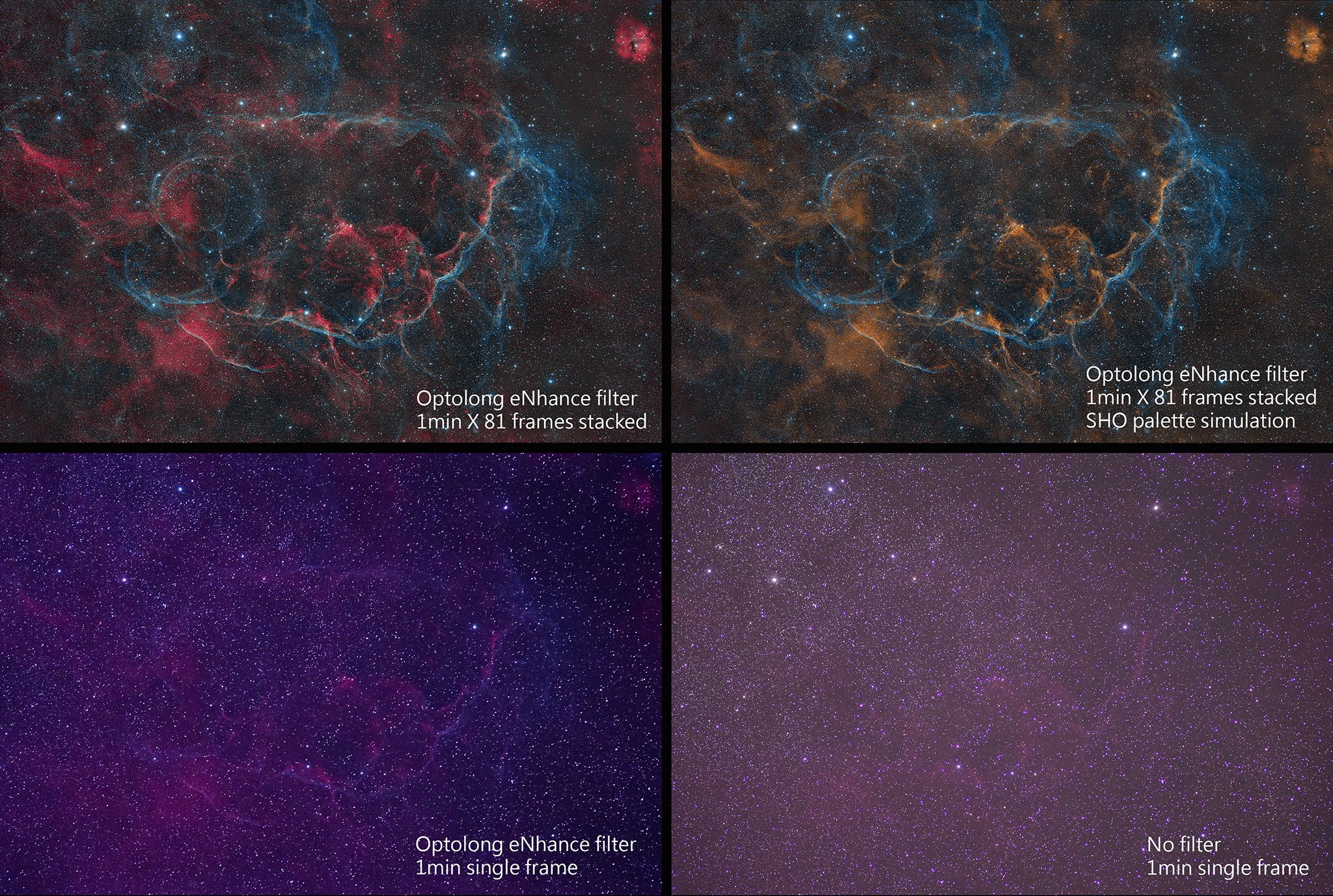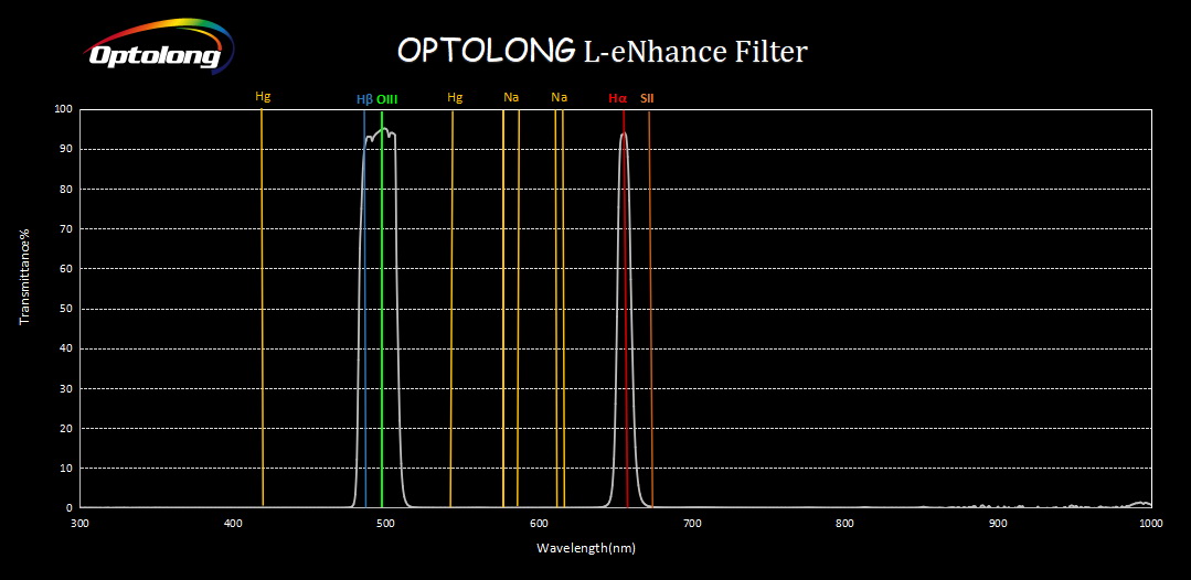 Wie funktioniert es? Der neue Optolong L-eNhance Filter wurde entwickelt, um möglichst effektiv Schmalbandaufnahmen mit Farbkameras betreiben zu können. Eine übliche Bayermatrix filtert das einfallende Licht nach Rot/Grün/Blau und da kam die Idee, dies mit einem Schmalbandfilter welcher nur die beiden Linien passieren lässt zu kombinieren. Das rote H-Alpha Licht wird von den roten Pixeln und das blaugrüne OIII Licht von den blauen und grünen Pixeln durchgelassen. So kann man mit einer einzigen Aufnahme sowohl H-Alpha als auch O-III erfassen. Es ist mit dem L-eNhance Filter daher nicht mehr nötig, die Schmalband Frames getrennt aufzunehmen, sondern man kann das verfügbare Signal in beiden Kanälen tatsächlich auf einer Aufnahme registrieren. Man kann das als ganz normales Farbbild weiterverarbeiten, oder aber mit geeigneter Software die Kanäle getrennt auslesen und so reine nicht debayerte Schmalbandbilder erhalten (zB mit dem Prozess SplitCFA in PixInsight).
