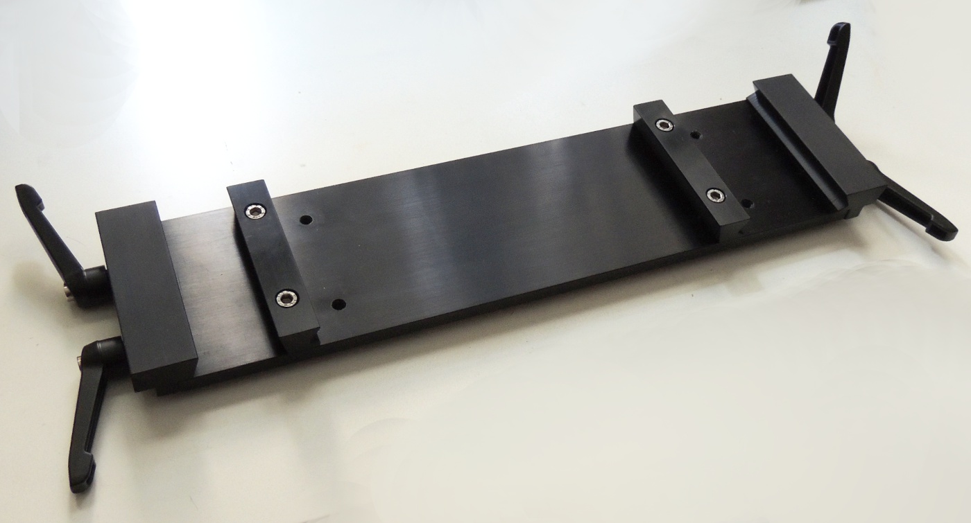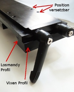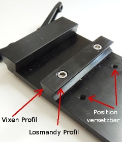 Mit dieser Doppelbefestigungs-Schiene kann man an beiden Seiten sowohl Vixen, als auch Losmandy-Profil klemmen. Die beiden Klemmbacken haben an einer Seite Vixen, an der anderen Seite Losmandy Profil und können in zwei verschiedenen Positionen verwendet werden. Auch die Anschläge, die fest auf der Platte verschraubt sind, können umgedreht werden, man kann sich die Aufnahme so ändern, wie man es braucht. Also Losmandy - Vixen, Vixen - Vixen, usw...