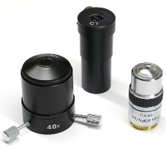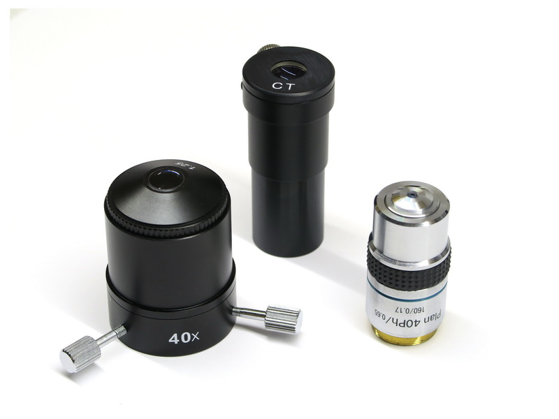 Nur 40x Vergrößerung: Diese Sparlösung besteht nur aus einem 40x PLAN-Phasenkontrast Objektiv und einem Kondensor mit PH-Ringblende. Es gehört auch ein CT-Justier Teleskop zum Set, um die optischen Elemente genau justieren zu können.
