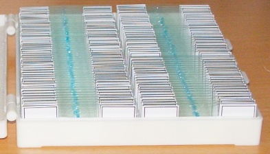 prep14chromo = Chromosomen: Zwiebelwurzelspitze, Zwiebelfilament, Lilienfilament, Narzisse, Puffbohne, (alle in Mitose oder Meiose mit sichtbaren Chromosomen), Pferdespulwurm-Eier, Heuschrecke (Hoden), Speicheldrüse (mit Riesenchromosomen), Menschliche Chromosomen im Ausstrich jeweils des männl. und des weibl. Blutes, Spulwurm (megalocephala), Uterus (Gebärmutter), Eisenhämatoxylin-Färbung (um die Meiose mit Kernspindeln zu zeigen), Fruchtfliege Riesenchromosomen (Ausstrich, Quetschpräparat, Abschnitt) (Bild: links 5. von oben)