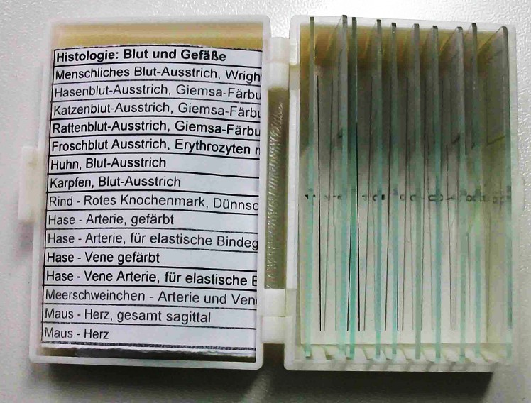 prep15blood = Histologie: Blut und Gefäße Menschlicher Blut-Ausstrich (Wright-Färbung), Hasenblut-, Katzenblut- und Rattenblut-Ausstriche (alle 3 Giemsa-Färbung), Froschblut Ausstrich (Erythrozyten mit Zellkern), Blut-Ausstriche (Karpfen, Frosch, Huhn), Rotes Knochenmark vom Rind (Dünnschnitt), Hase (Arterie, einfach bzw. für elastische Bindegewebsfasern gefärbt), nochmal Hase (Vene, einfach bzw. für elastische Bindegewebsfasern gefärbt), Meerschweinchen (Arterie und Vene auf einem Schnitt), Maus (Herz, gesamt sagittal) (Bild: links 3. von oben)
