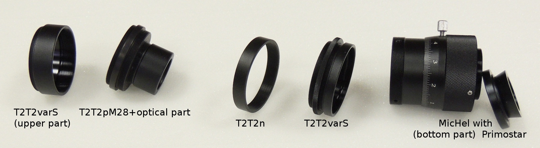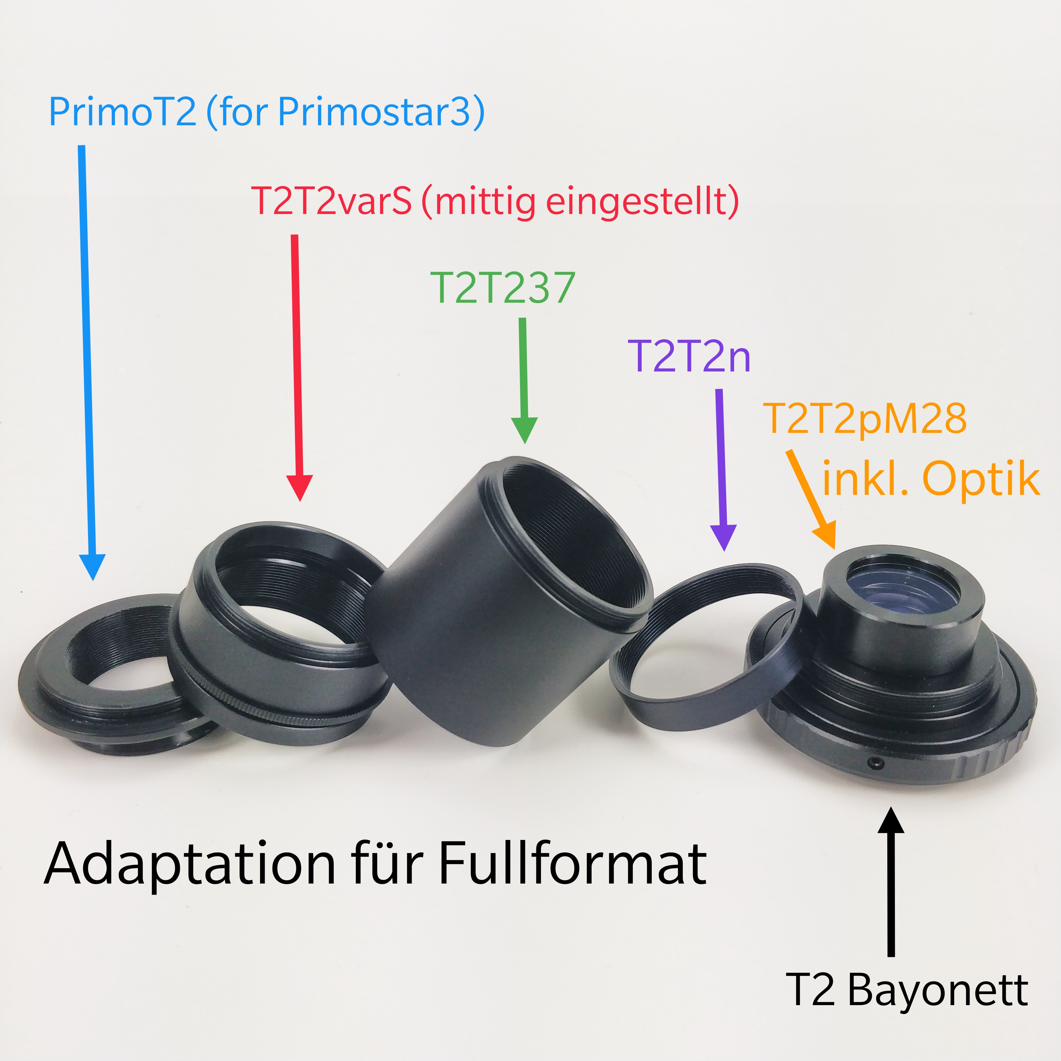 Das Fullformat Set besteht aus: PrimoT2 Adapter (für Primostar3), T2T2varS (mittig eingestellt), T2T237, T2T2n, T2T2pM28 (als Fassung für die Optische Einheit) und ein T2-DSLR Adapter nach Wahl