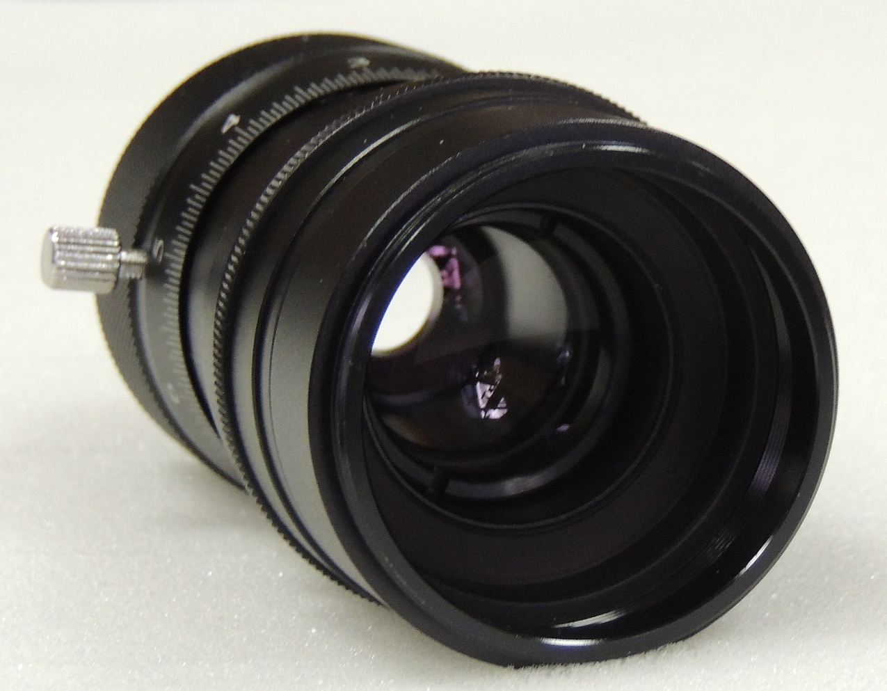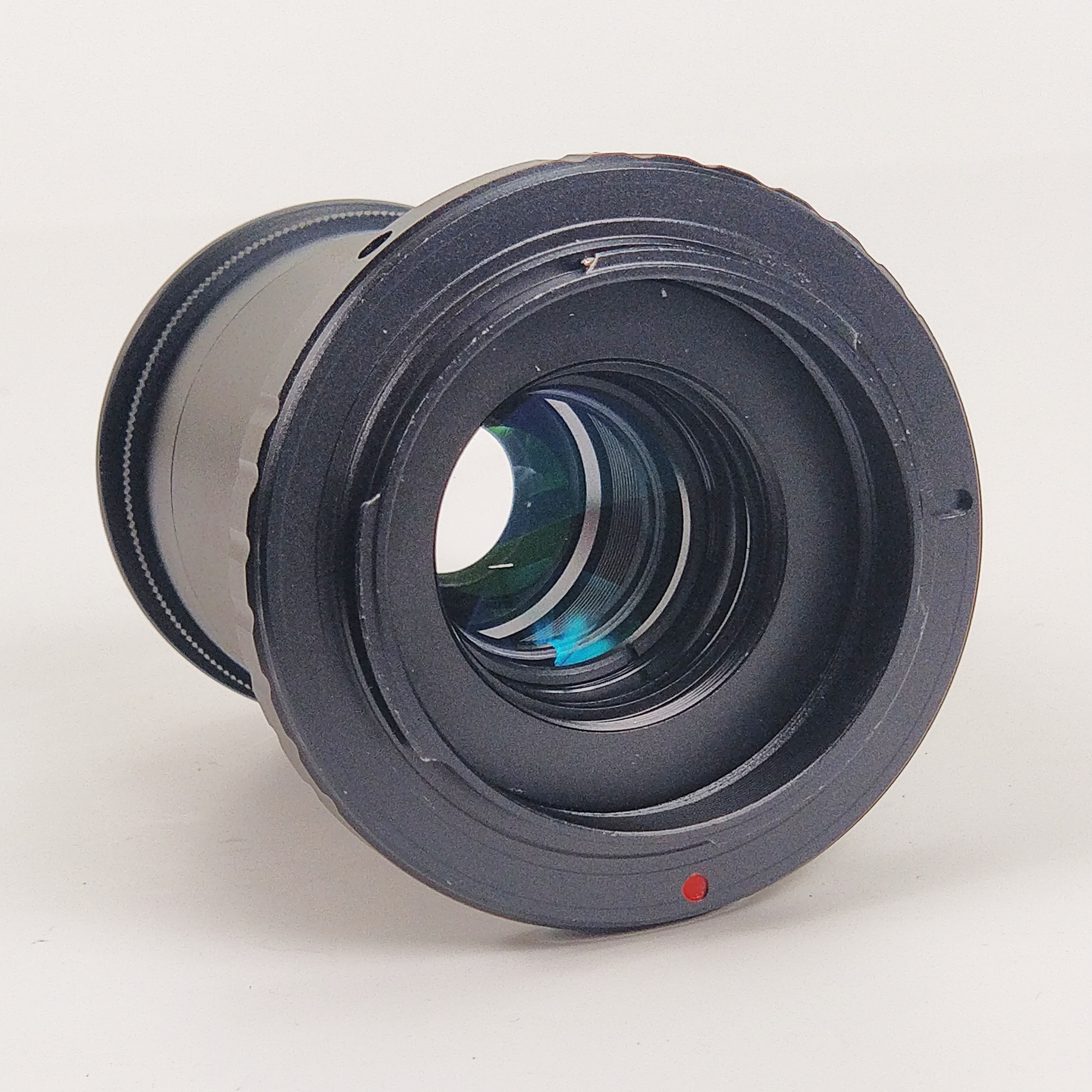 - Die zweite Lösung verwendet zusätzlich eine Zwischenoptik, welche den Bildkegel sozusagen "spreizt" und dadurch den Beleuchtungsgrad vergrößert. Bei DSLR-Kameras mit APS-C Format verschwindet die Vignettierung vollständig, bei vollformatigen DSLR-Kameras wird sie zwar noch wahrgenommen, ist aber kaum mehr störend.
