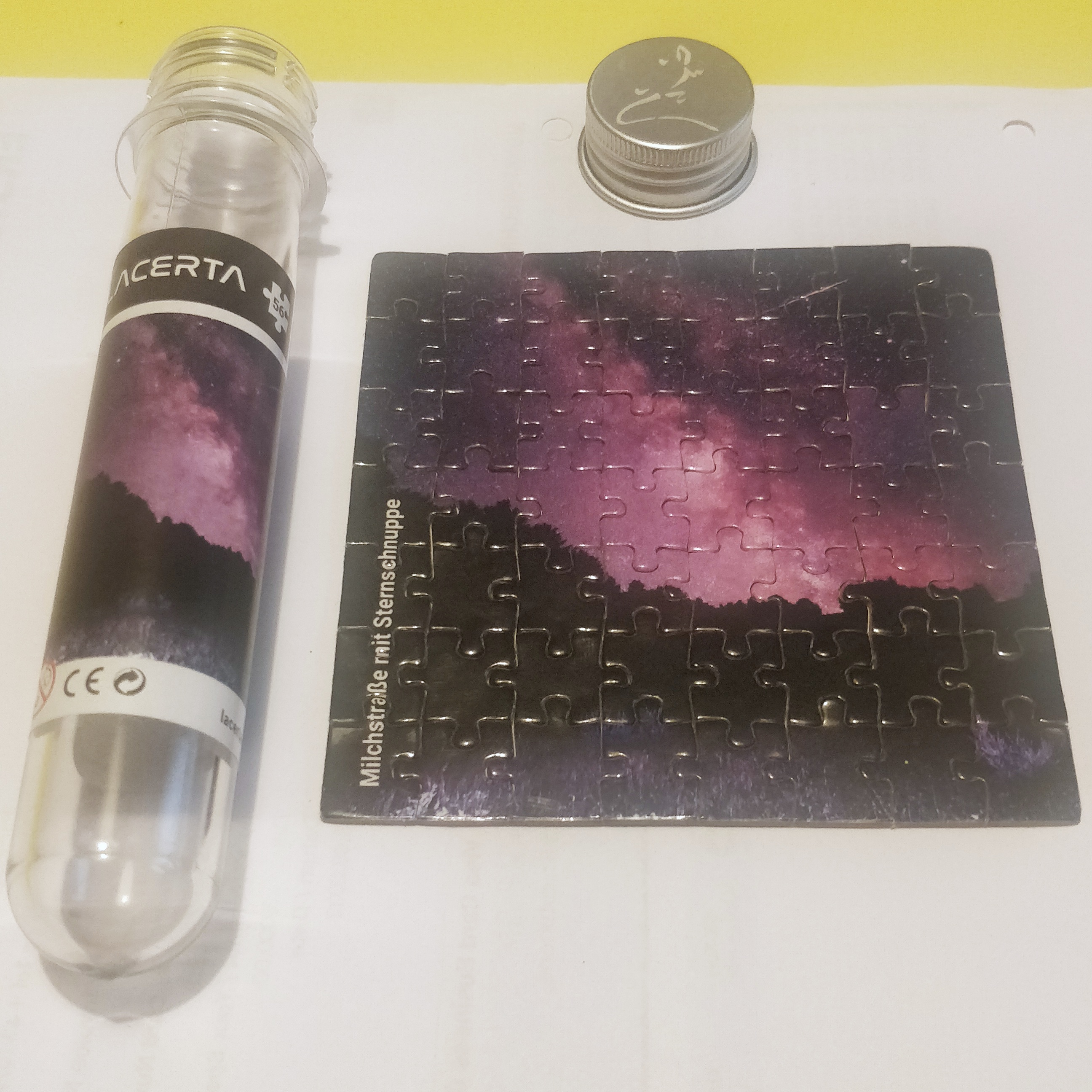 Auch die Verpackung ist besonders. Anstelle einer Schachtel werden die Puzzleteile in ein Reagenzglas gelegt. Man kann es auch symbolisch sehen...