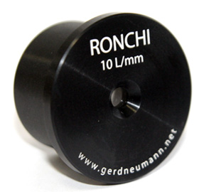 Das Ronchi-Okular besteht aus einem Grundkörper mit 31,7mm Steckanschluß, aus schwarz eloxiertem Aluminium, in dem eine kleine Glasplatte mit einem aufgedampften Gitter montiert ist. Bei einigen Ronchi-Okularen besteht dieses Gitter aus einem Film oder gar dem Ausdruck eines Laserdruckers: Diese Ronchi-Okulare liefern in der Regel ein Streifenbild mit einem geringen Kontrast und machen die Interpretation der Bilder gerade für Einsteiger sehr schwierig. Dagegen ist in diesem Ronchi-Okular eine feinoptisch polierte Glasplatte eingebaut, auf deren objektivseitiger Oberfläche ein Gitter mit 10 Linien pro Millimeter aufgedampft ist.