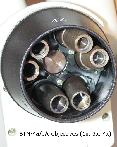 Neben den unterschiedlichen Beleuchtungsvarianten unterscheiden sich die STM4-Mikroskope hauptsächlich durch die dritte Vergrößerungsstufe von den STM3-Modellen. Sie verfügen werkseitig über 10x, 30x und 40x Vergrößerungen und sind deshalb besonders flexibel einsetzbar. Der Wechsel zwischen den Vergrößerungen geschieht durch Drehen der Objektivhalterung um 120° sehr einfach und schnell. Der minimale Augenabstand beträgt 52mm, alle Modelle besitzen Präparatklemmen.