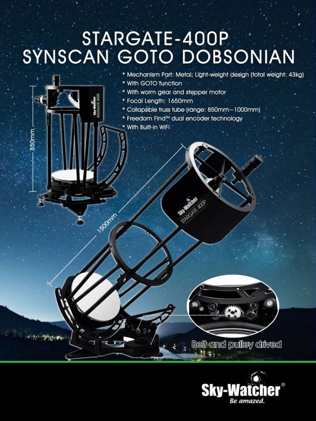 Der 16 Zoll Skywatcher Dobson wurde überarbeitet und ist nun als Stargate-400P als vollständige Gitterrohrkonstruktion erhältlich. Dadurch ist er leichter zu transportieren und aufzubauen, er kann von einer Person getragen werden. Ausgestattet mit dem bewährten SkyWatcher SynScan GoTo-System mit einer großen Datenbank von 42.900 Objekten.