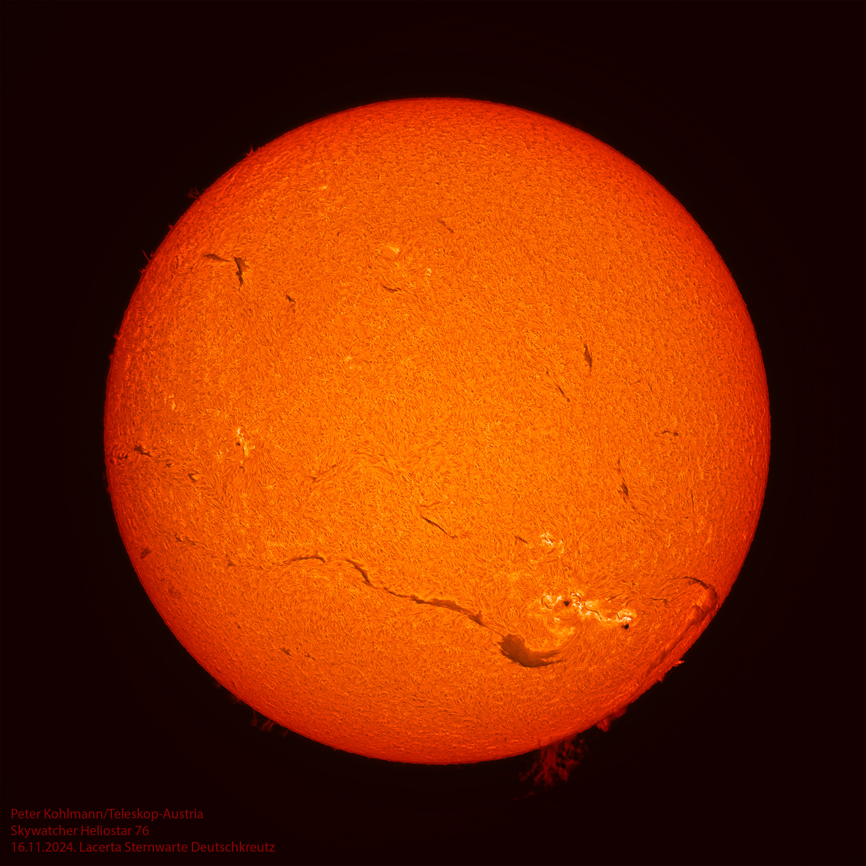 Das 76-mm-Sonnenteleskop Sky-Watcher Heliostar ist auf die 656,28-nm-Linie von Wasserstoff-Alpha abgestimmt und ermöglicht eine detaillierte Sicht auf Sonneneruptionen (Protuberanzen) und die SOnnenoberfläche. Ein wichtiger Parameter für Sonnenteleskope ist die Bandbreite des Filters (H-Alpha), die den Kontrast des Bildes und die Sichtbarkeit von Oberflächendetails bestimmt. Eine Bandbreite von 0,5 Angström (oder weniger) ergibt einen außergewöhnlich guten Kontrast, der dem Teleskop einen hervorragenden Blick auf die Oberfläche unseres Zentralsterns und auch auf Protuberanzen (Sonneneruptionen) ermöglicht.